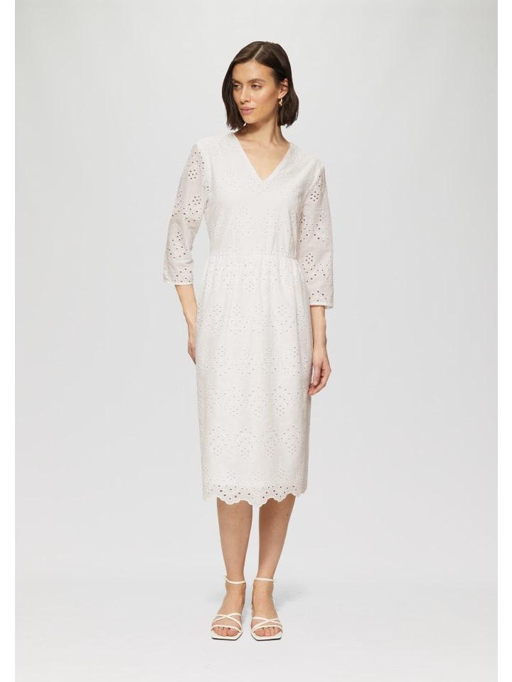 Очаруйте себя этим романтичным платьем миди с шитьем англез! V-образный вырез и рукава три четверти придадут вам женственный вид. Воздушный хлопок с ажурной вышивкой идеально подходит для теплых летних дней или праздничных случаев. Сочетайте его с сандалиями для непринужденного завтрака или с каблуками для элегантного вечера. Универсальный must-have вашего гардероба!