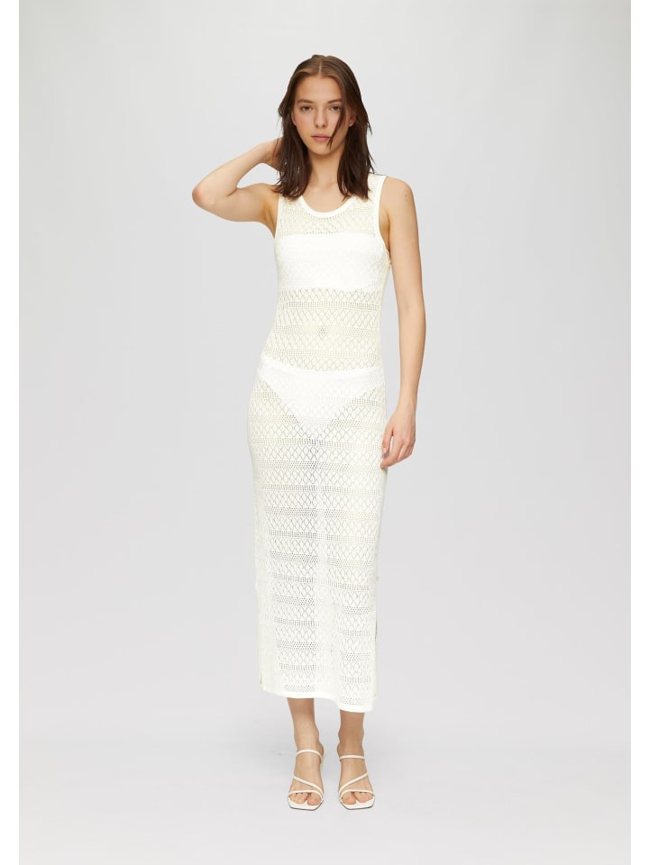 Прозрачное платье тонкой вязки с ажурным узором: ваш стильный спутник для прохладных летних дней! Это эластичное платье миди из смесовой вискозы сочетает в себе модный вид и комфорт. Идеально подходит для фестивальной атмосферы или расслабленных городских прогулок.
