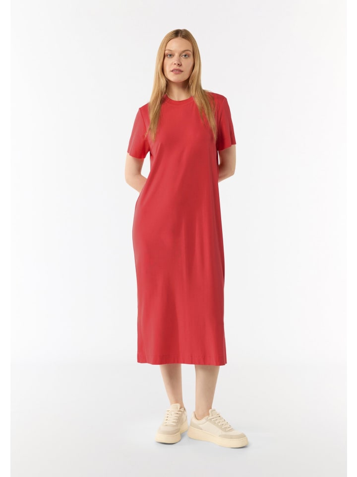 Вневременная элегантность длины миди. Это платье с круглым вырезом и боковыми разрезами впечатляет своим классическим видом и свободным кроем. Короткие рукава и ребристый вырез горловины придают вам непринужденный шик - идеальный вариант для непринужденного повседневного образа. Сочетайте это платье с кроссовками или сандалиями для создания удачного летнего образа.