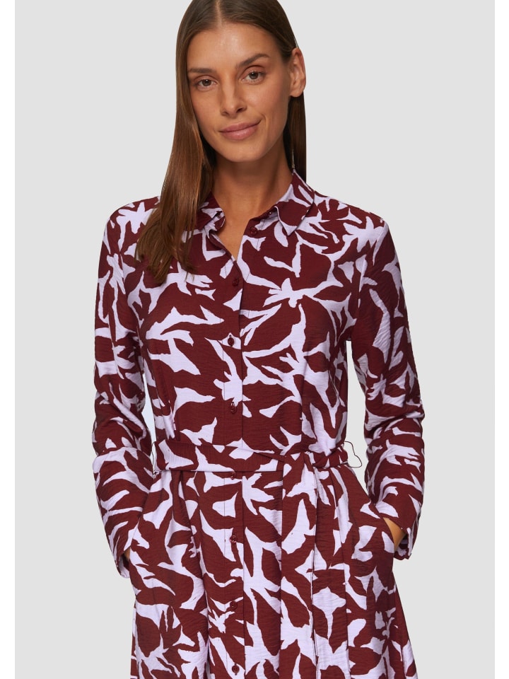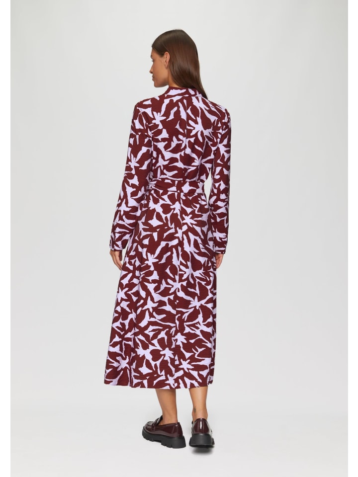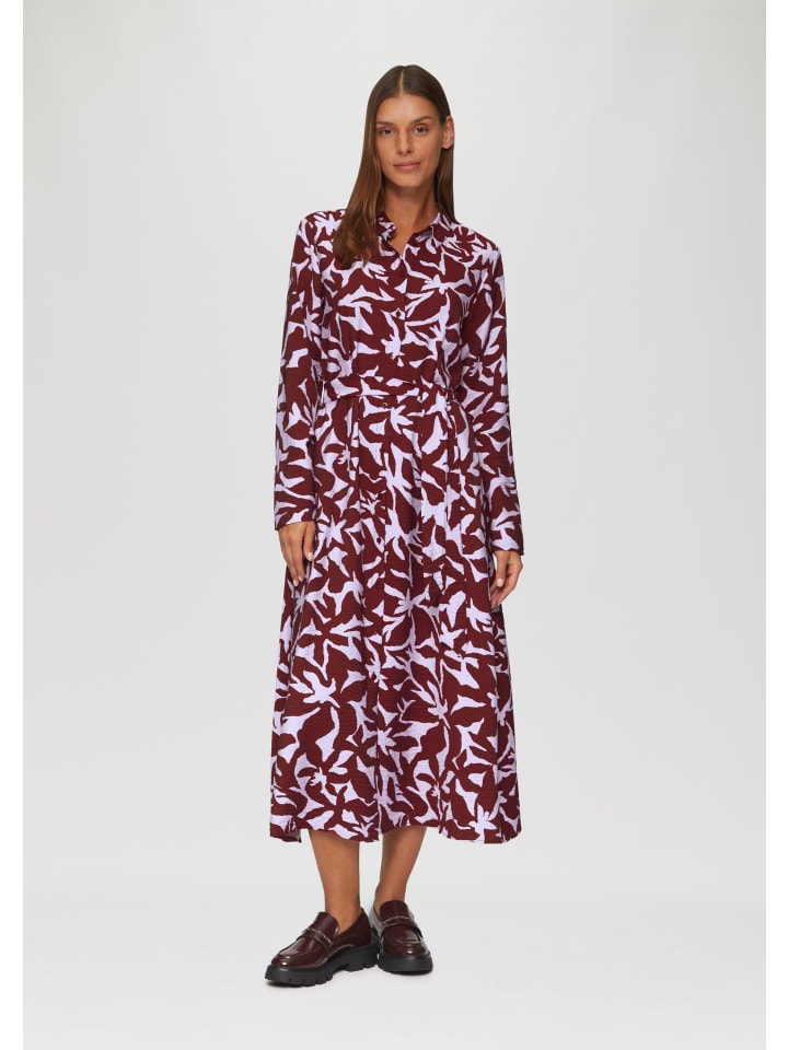 Это струящееся платье миди с принтом по всей поверхности сочетает в себе женственную элегантность и непринужденный стиль. Классический рубашечный воротник, практичные боковые карманы и завязывающийся пояс делают его идеальным дополнением для стильных и непринужденных дней.