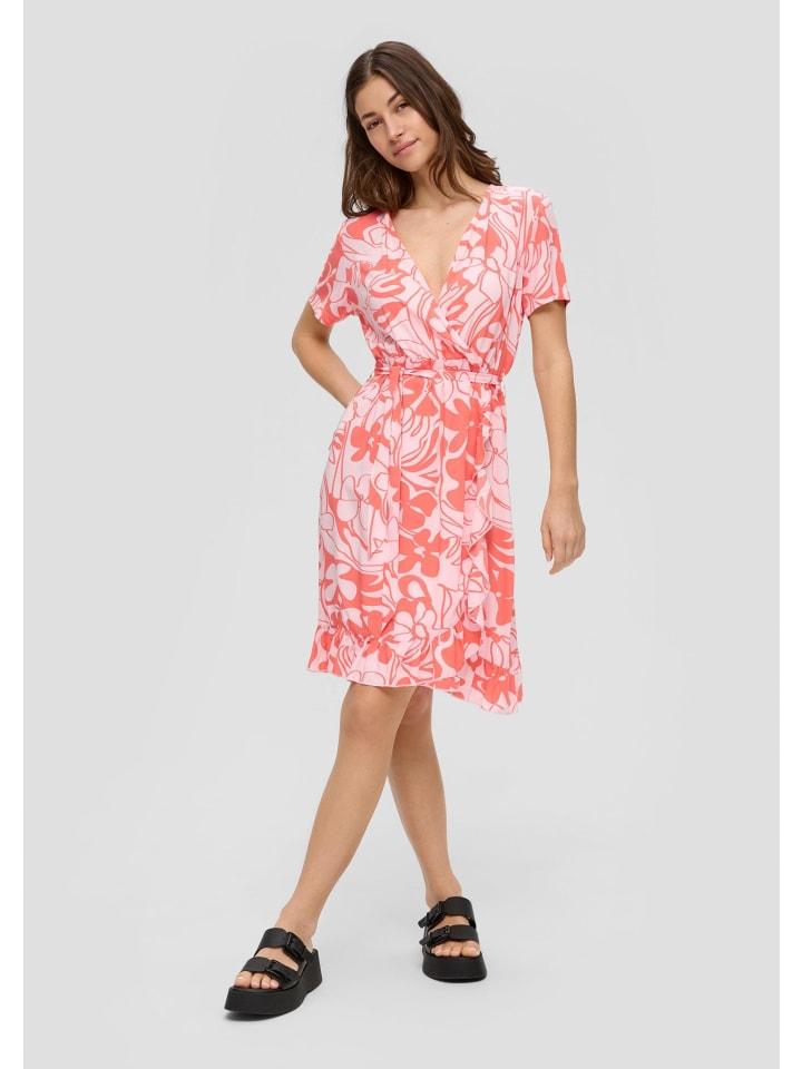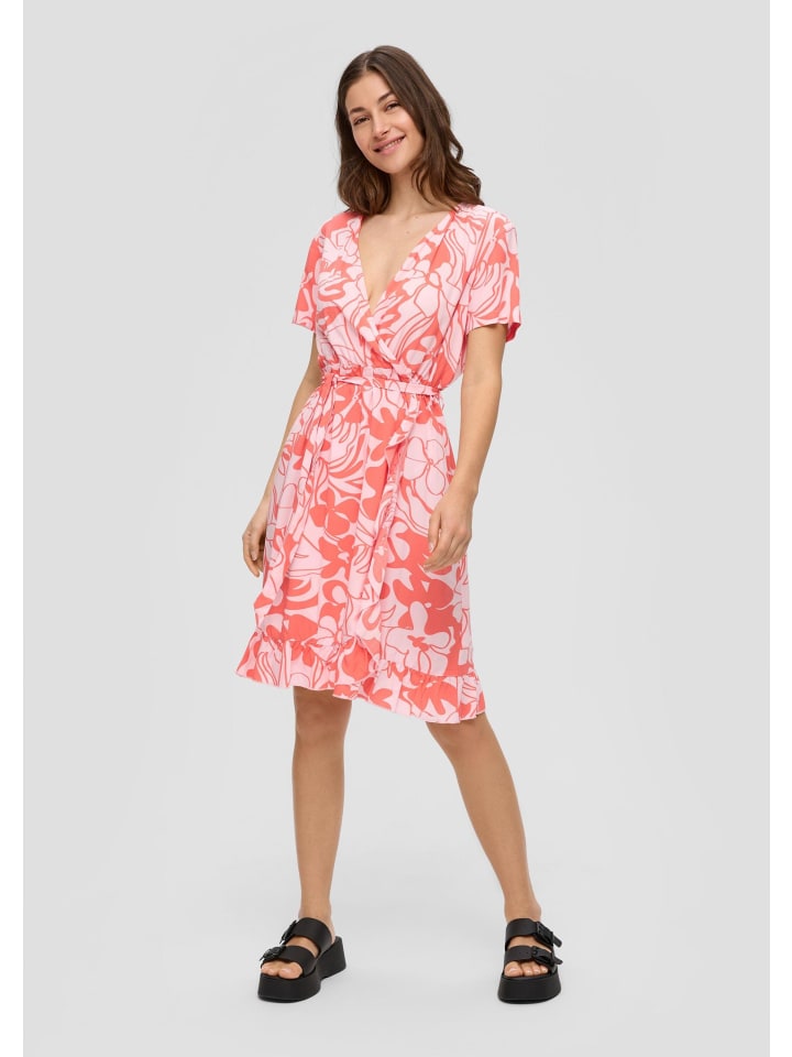 - Крой на запах с оборками, сборками и принтом по всей поверхности