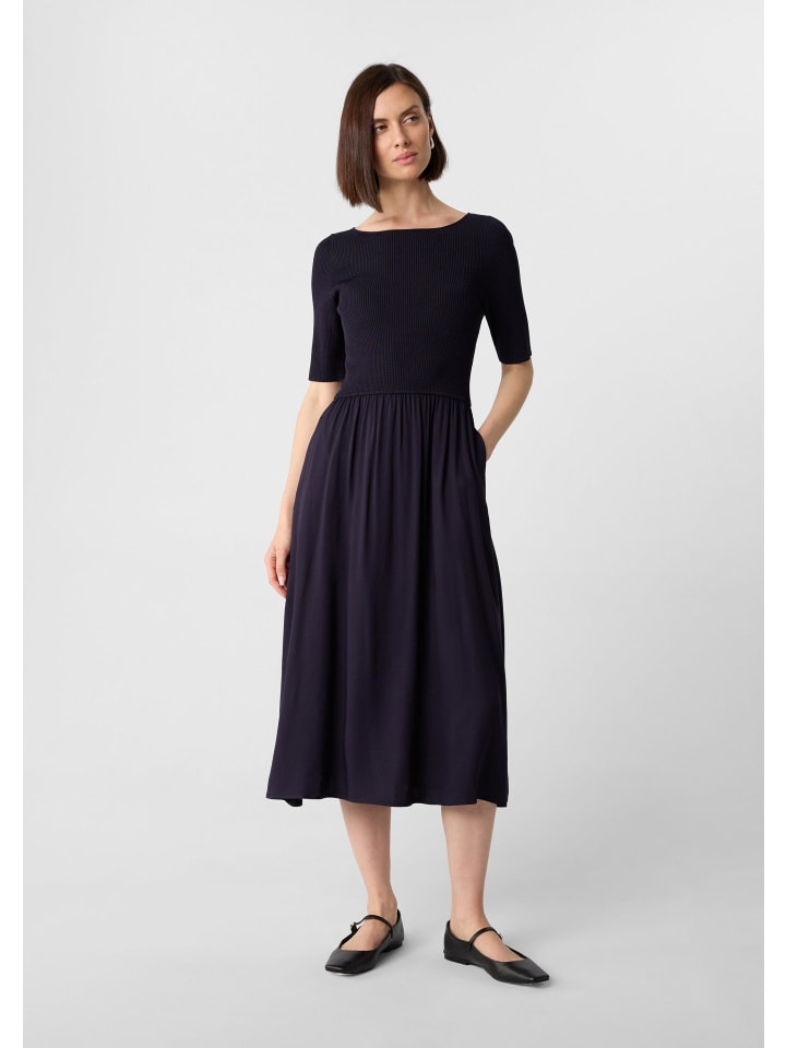 Изысканная элегантность и современный комфорт: это платье миди из изысканного сочетания тонкого трикотажа и саржи впечатляет своим женственным силуэтом. Вырез лодочкой и расклешенный подол добавляют стильные акценты, а эластичный пояс и практичные боковые карманы гарантируют максимальный комфорт. Облегающий крой и вискозная ткань подчеркивают фигуру и делают платье универсальным дополнением к любому образу.