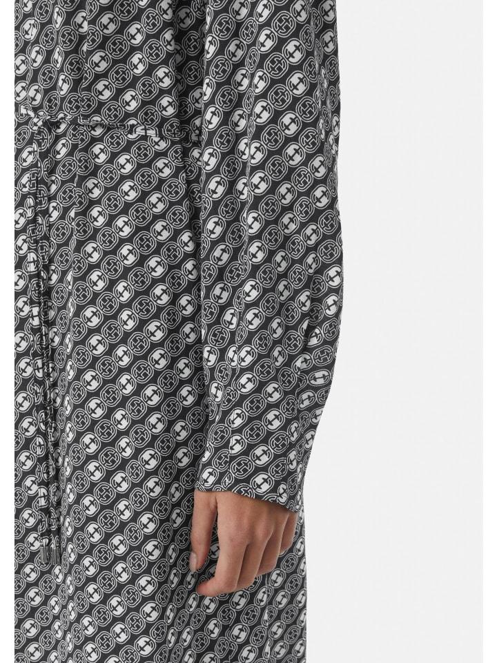 Платье из крепа с принтом в виде иконок: роскошь на каждый день. Это платье с длинными рукавами из 100% вискозы выгодно подчеркивает фигуру благодаря струящейся драпировке. V-образный вырез добавляет женственности, а принт на этикетке тонко подчеркивает ваш вкус. Идеально подходит для деловых встреч или элегантных вечерних мероприятий - сочетайте его с туфлями-лодочками для создания изысканного образа или с кедами для создания непринужденного шика.