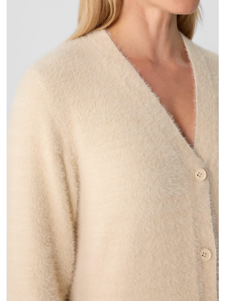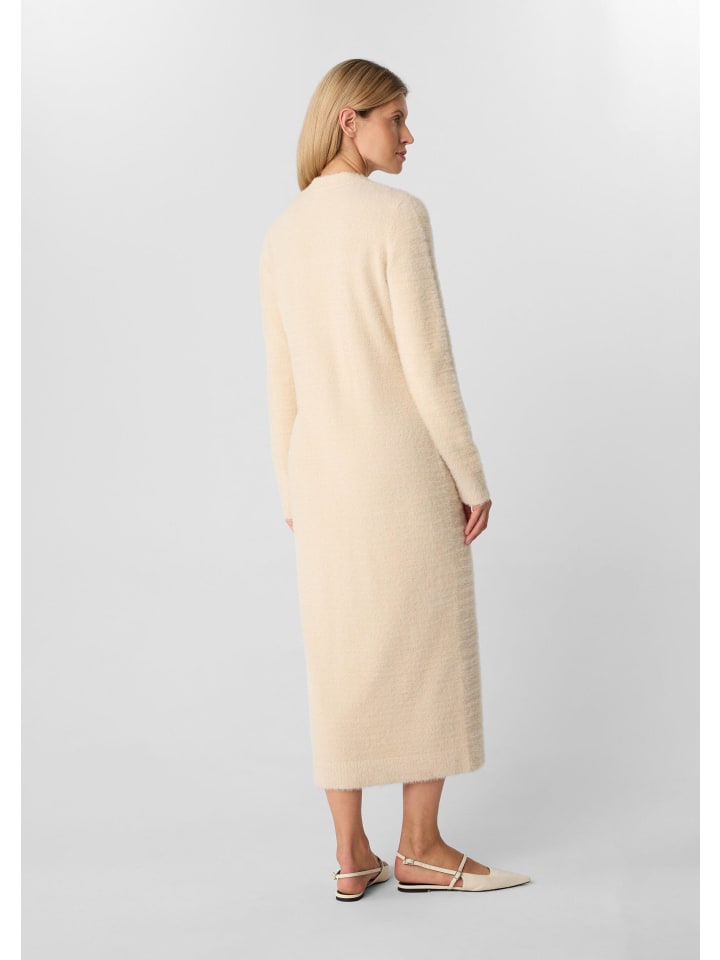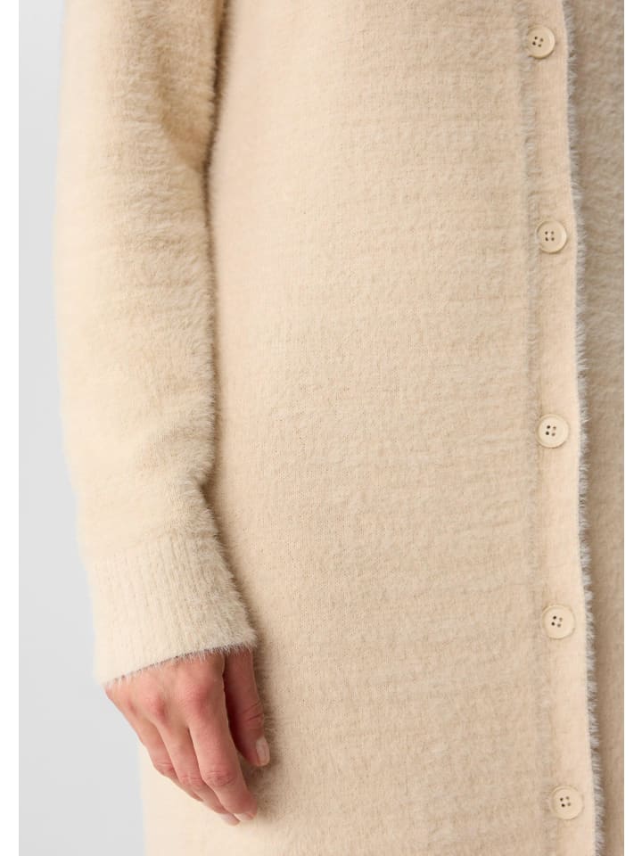 Элегантность и комфорт: это мягкое платье-кардиган макси подчеркнет вашу фигуру благодаря струящемуся крою и эластичной ткани. V-образный вырез и длинная планка на пуговицах добавят женственности, а ребристые манжеты и подол обеспечат идеальную посадку. Сочетайте его с кроссовками или элегантно с туфлями-лодочками - эта универсальная модель поможет вам стильно провести день.