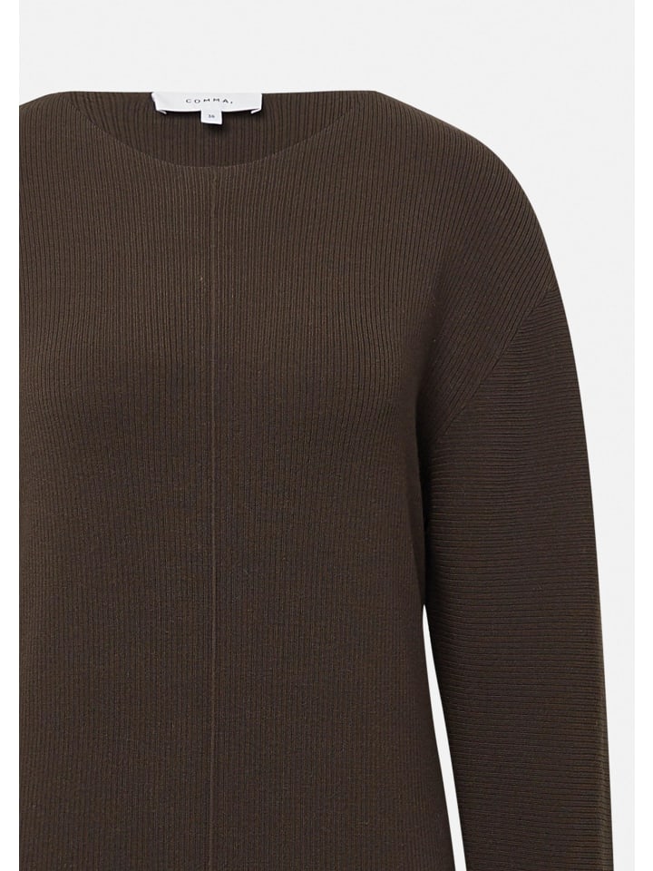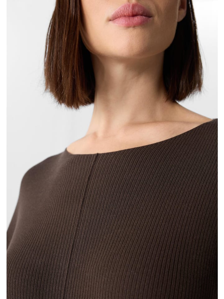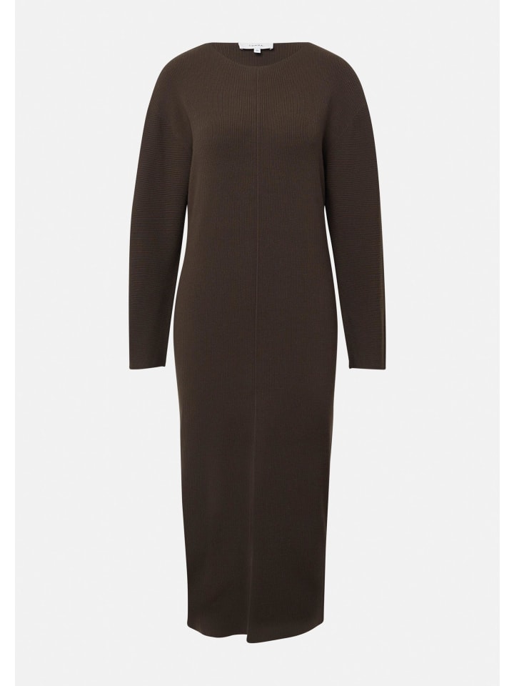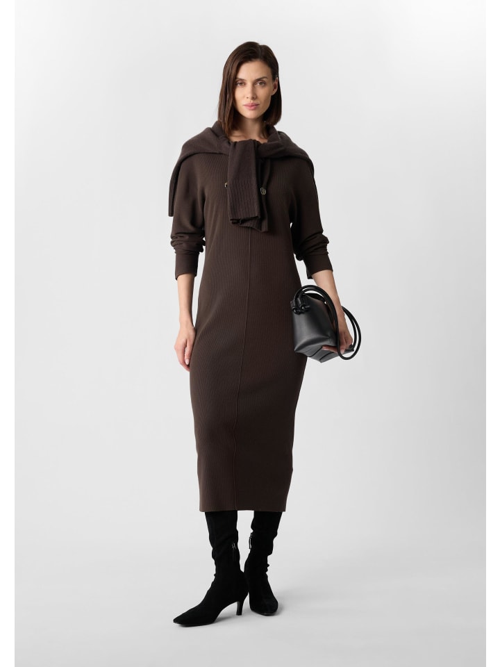 Это платье миди из ребристого трикотажа уникально сочетает в себе комфорт и современную элегантность. Мягкая, тонкая вязка мягко облегает фигуру, а спущенная линия плеча создает непринужденный силуэт. Швы добавляют изысканные акценты и подчеркивают женственность. Классический круглый вырез гармонично дополняет дизайн. Благодаря прямому крою и эластичной ткани оно обеспечивает исключительный комфорт. Сочетайте его с ботильонами и пальто для создания элегантного образа или сочетайте с: