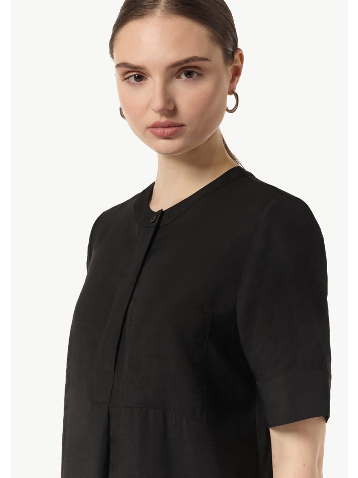 Вневременная женственная элегантность: это платье-футболка с воротником-стойкой впечатляет своим классическим видом. Расклешенный крой и короткие рукава создают привлекательный силуэт. Пуговицы и V-образный вырез - изысканные детали, делающие платье универсальным предметом гардероба для создания повседневного шика. Будь то офис или прогулка по городу, это тканое мини-платье станет вашим новым фаворитом.