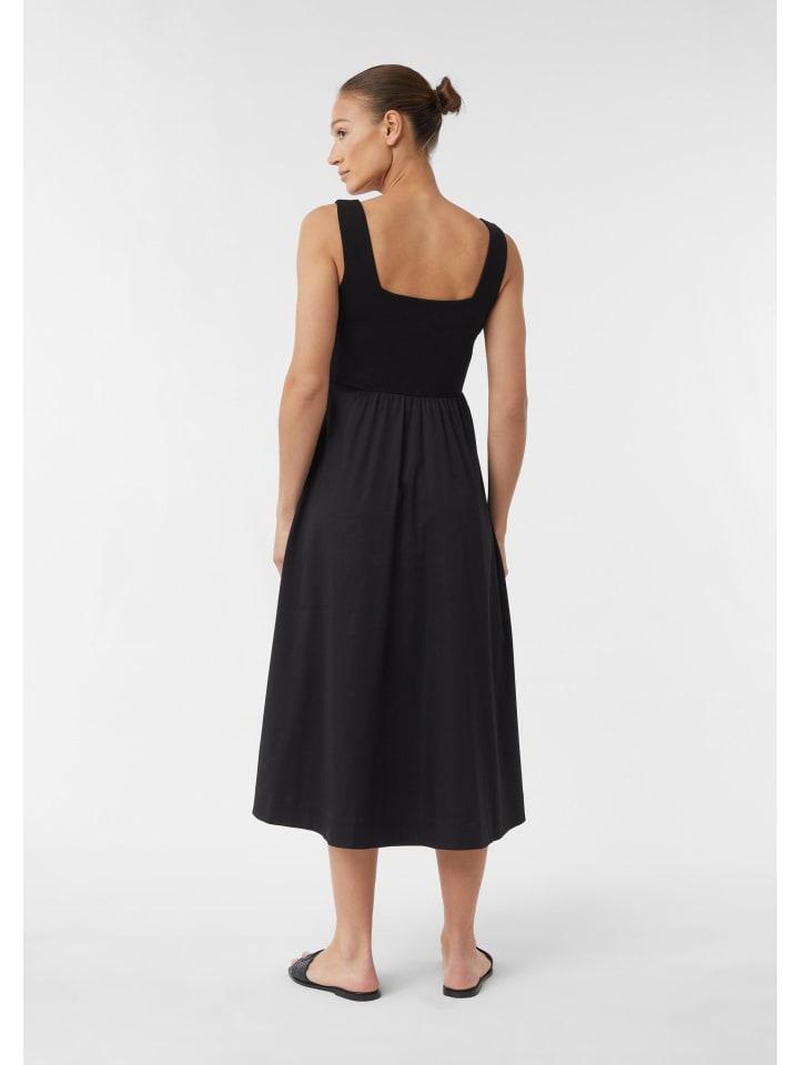 Элегантный силуэт и летняя легкость: это платье миди без рукавов с юбкой из поплина и квадратным вырезом станет вашим стильным спутником в теплые дни. Приталенный крой и расклешенный крой подчеркнут вашу фигуру, а воздушная юбка обеспечит комфорт. Сочетайте с сандалиями для создания повседневного образа или с туфлями-лодочками для создания элегантного образа.
