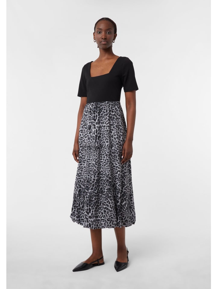 Это элегантное платье миди облегающего кроя с расклешенной юбкой впечатляет изысканным сочетанием материалов и женственным квадратным вырезом. Короткие рукава и частичная подкладка обеспечивают комфорт. Вы можете легко носить это платье как днем, так и вечером - сочетая его с кроссовками для создания непринужденного образа днем или дополняя вечерними туфлями-лодочками и эффектными украшениями.