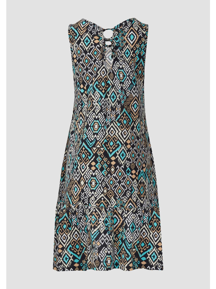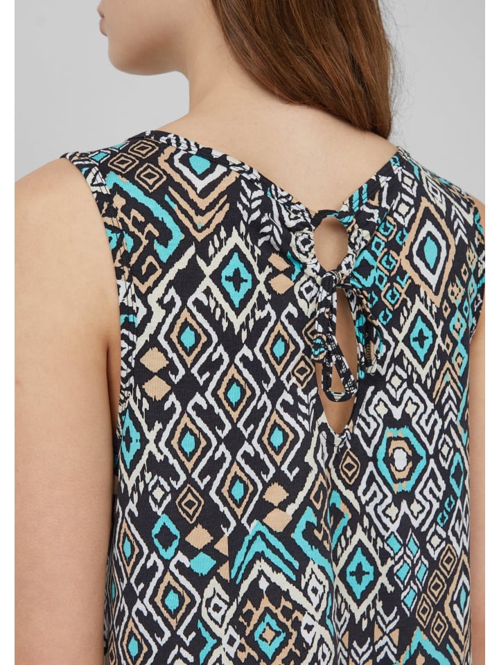 Это короткое трикотажное платье без рукавов очаровывает игривым многоуровневым дизайном и элегантным V-образным вырезом. Узор по всей поверхности и изысканный бант на спине добавляют женственности - идеально для расслабленных летних дней.