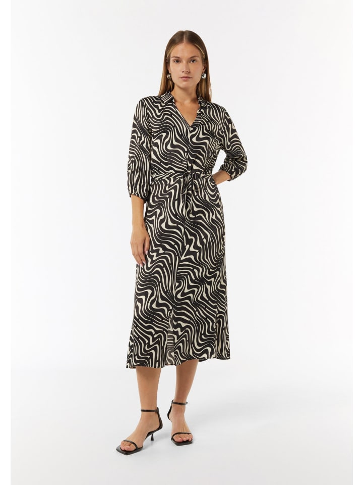 Откройте для себя женственную элегантность в нашем платье-рубашке с узором из струящейся вискозы. V-образный вырез и рукава три четверти добавляют изысканности, а кулиска на талии подчеркивает фигуру. Идеально подходит для деловых и повседневных образов - сочетайте его с туфлями-лодочками для создания элегантного образа или с кроссовками для непринужденного образа. Длина миди делает его универсальным дополнением к любому случаю.