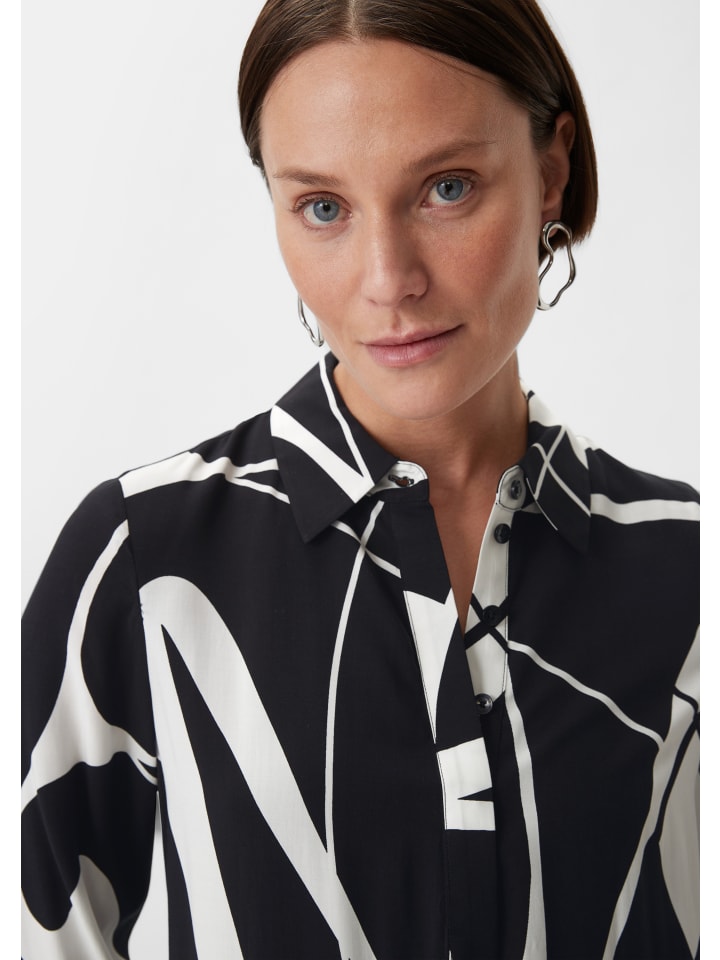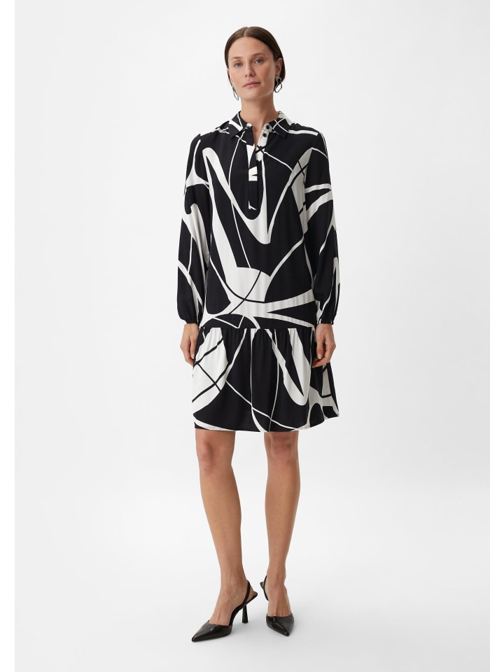 Платье из вискозы с модным принтом по всей поверхности. Отложной воротник и длинные рукава придают этому платью прямого кроя женственность. Платье на легкой подкладке с застежкой на пуговицы станет универсальным и повседневным акцентом вашего гардероба - носите его как самостоятельный предмет гардероба или дополните блейзером и аксессуарами.