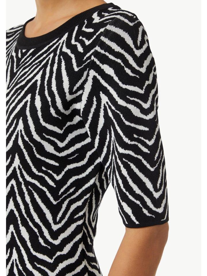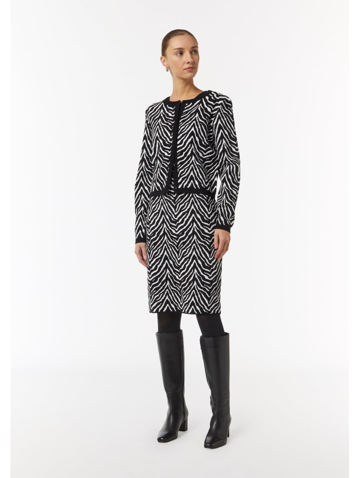 Это короткое трикотажное платье с жаккардовым узором добавит стильного штриха. Ребристая отделка придает изделию текстуру и выгодно подчеркивает фигуру. Сочетайте его с ботинками для создания смелого образа или с туфлями-лодочками для элегантного выхода. Универсальный дизайн позволит вам легко перенестись из офиса в ресторан.