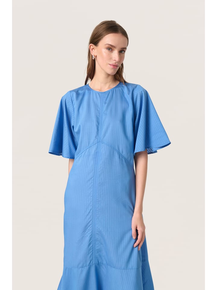 Свободно драпированное платье миди с легким блеском, круглым вырезом и широкими короткими рукавами. Сдержанный вертикальный фактурный рисунок.
