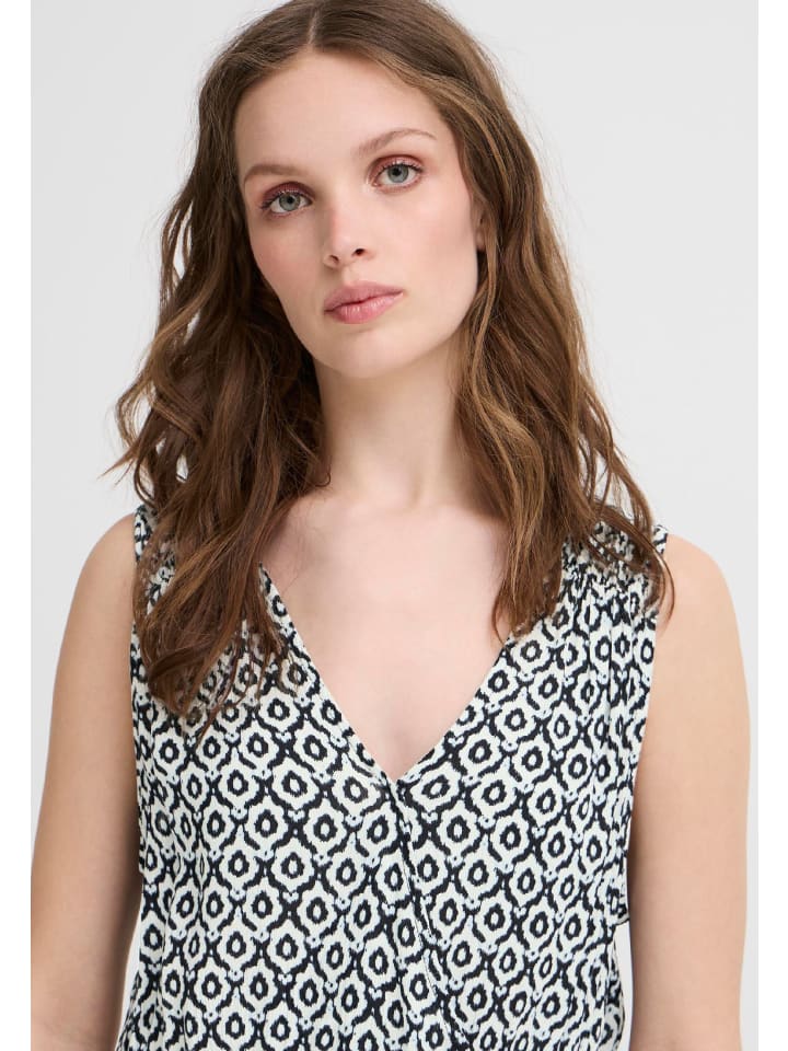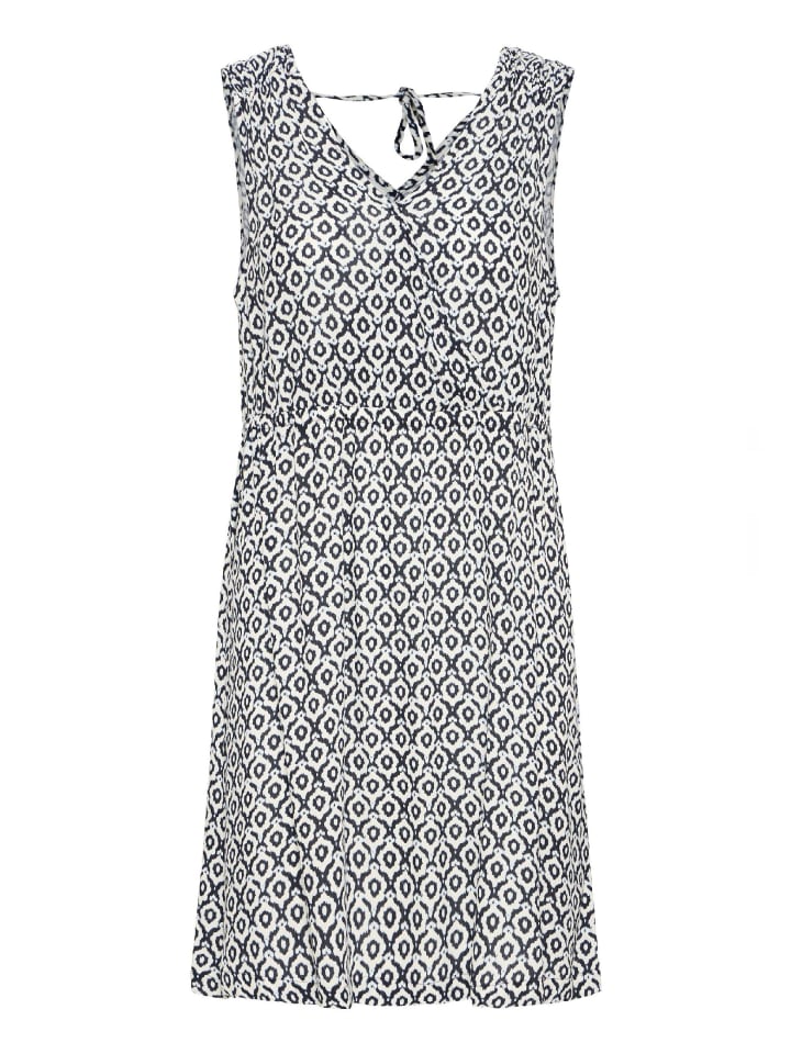 Короткое платье без рукавов с V-образным вырезом на запахе и подчеркнутой талией. Изящный А-силуэт, геометрический узор, завязка на шее.
