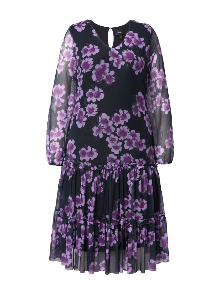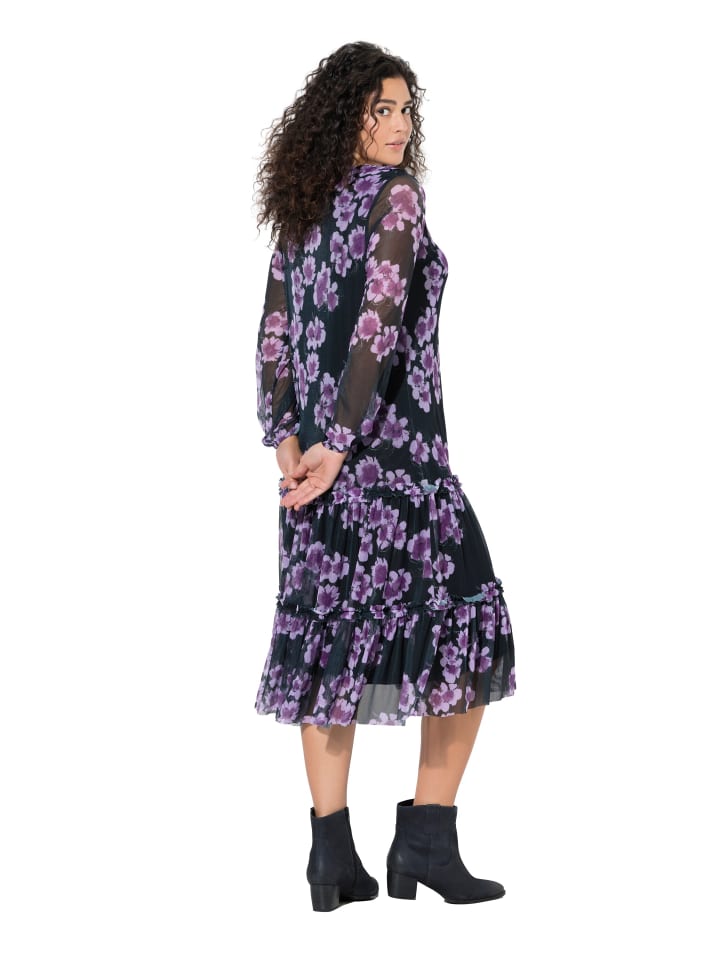 Платье миди, двухслойное, из слегка прозрачной сетки с цветочным принтом и плотной трикотажной подкладкой. Слегка скругленный V-образный вырез, разрез и застежка на пуговицу сзади, оборка на плечах. Воланы с изящной оборкой по подолу. Длинные рукава с эластичными манжетами.