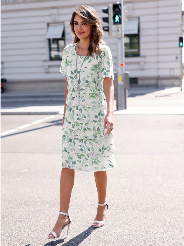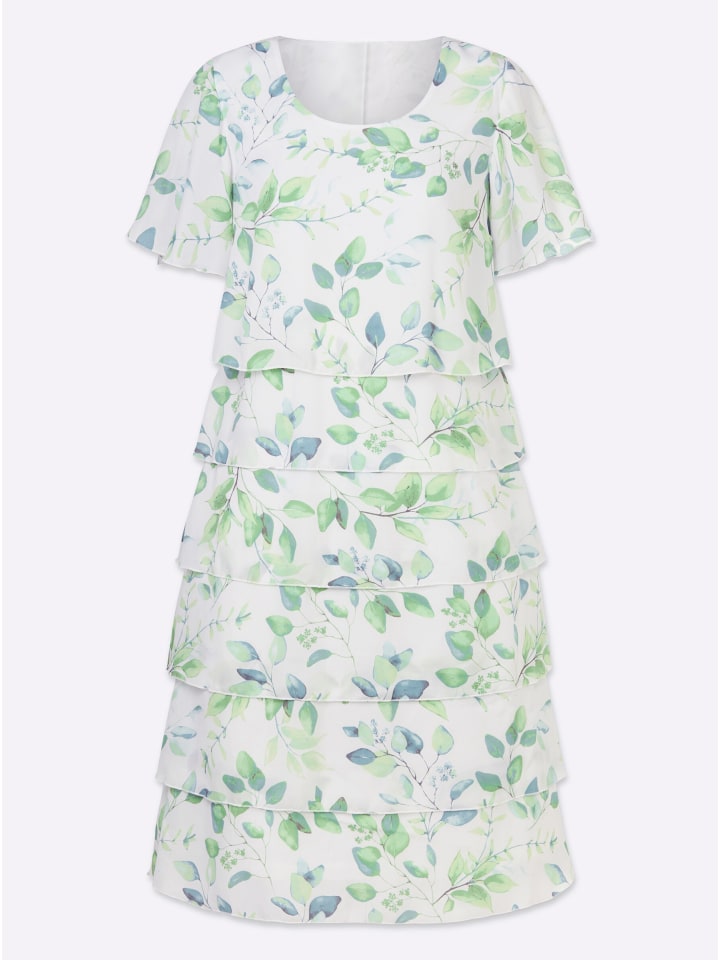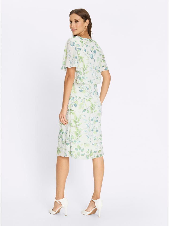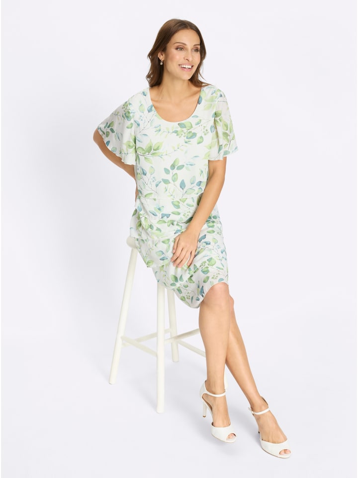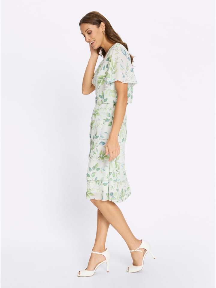 Сказочное платье с принтом в виде свежих листьев. Легкий многослойный фасон прекрасно подчеркивает фигуру. Воздушные рукава-крылышки. Платье с прямыми оборками. Вытачки на груди, потайная молния сбоку. Изготовлено из ткани-жоржета. Подкладка из плотного трикотажа.