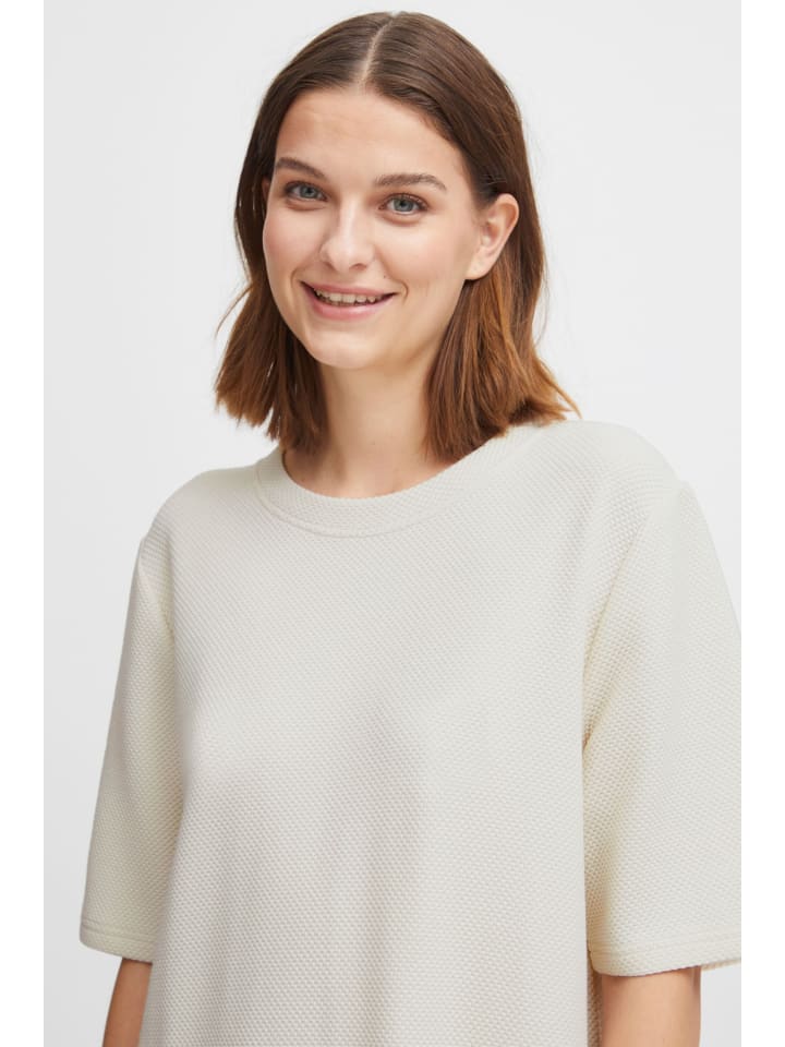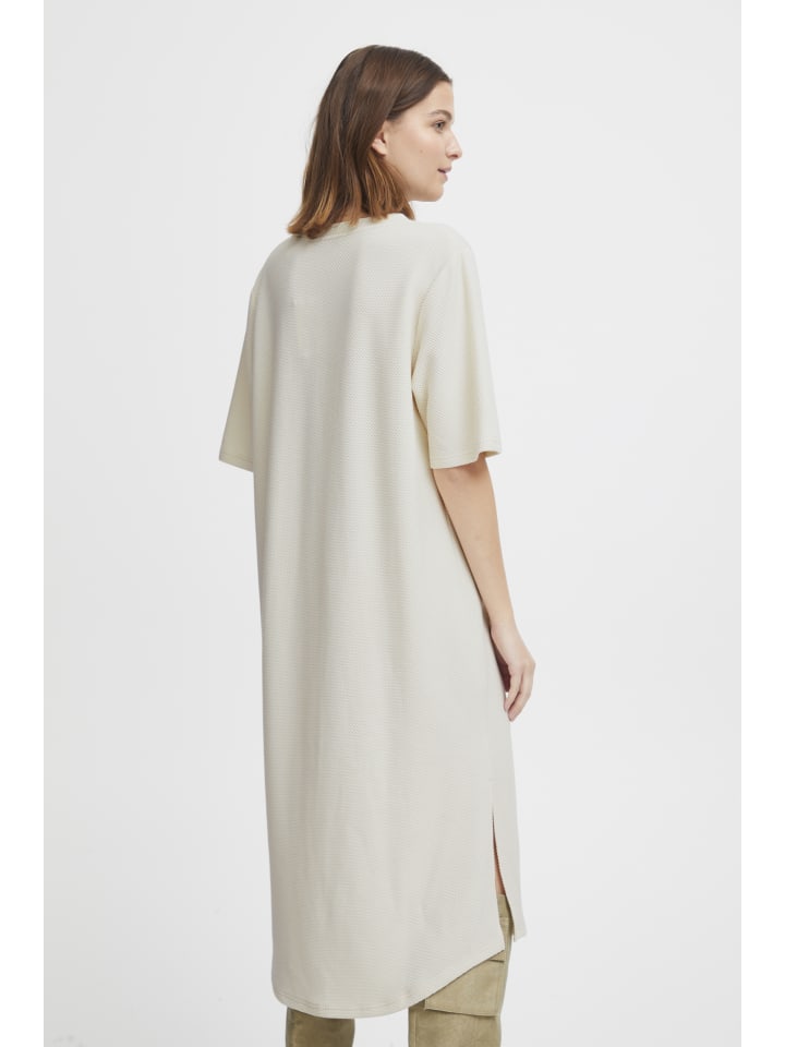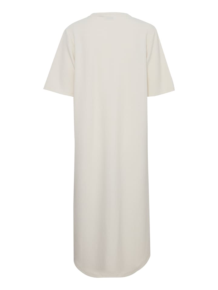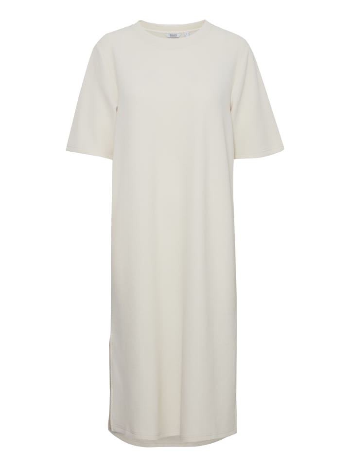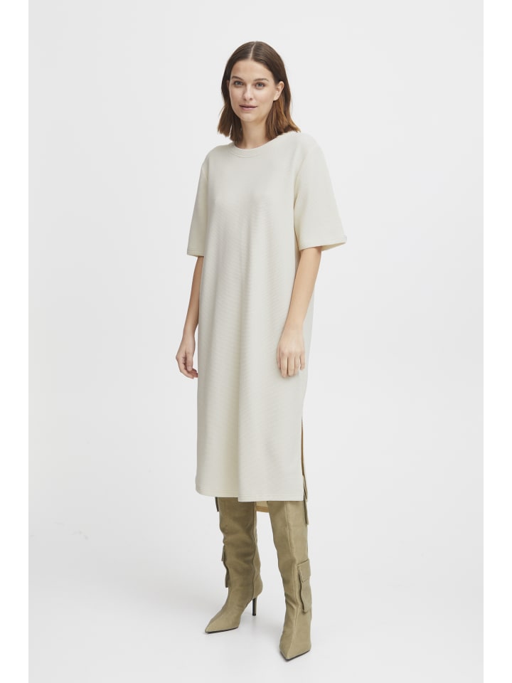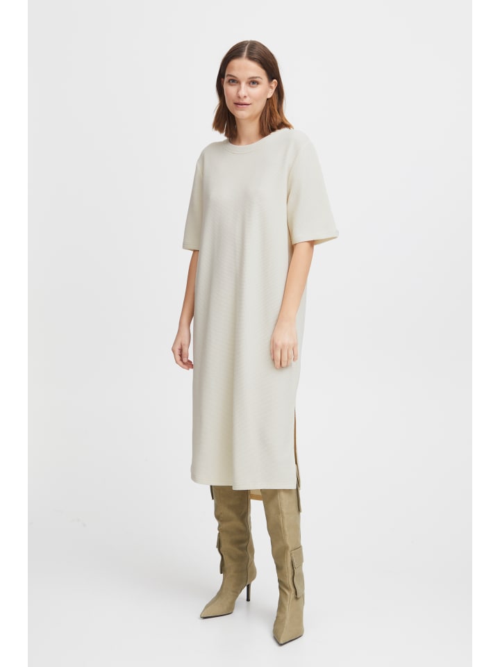Платье-футболка миди прямого силуэта с нежной текстурой. Круглый вырез горловины, рукава до локтя, боковые разрезы по низу.