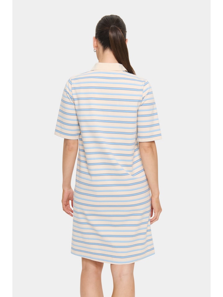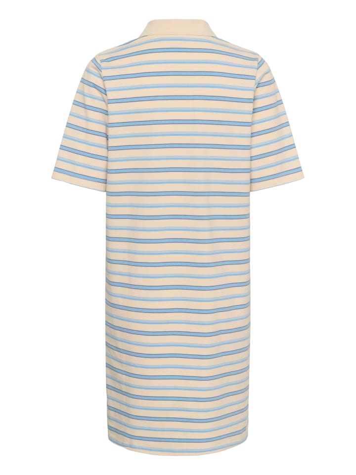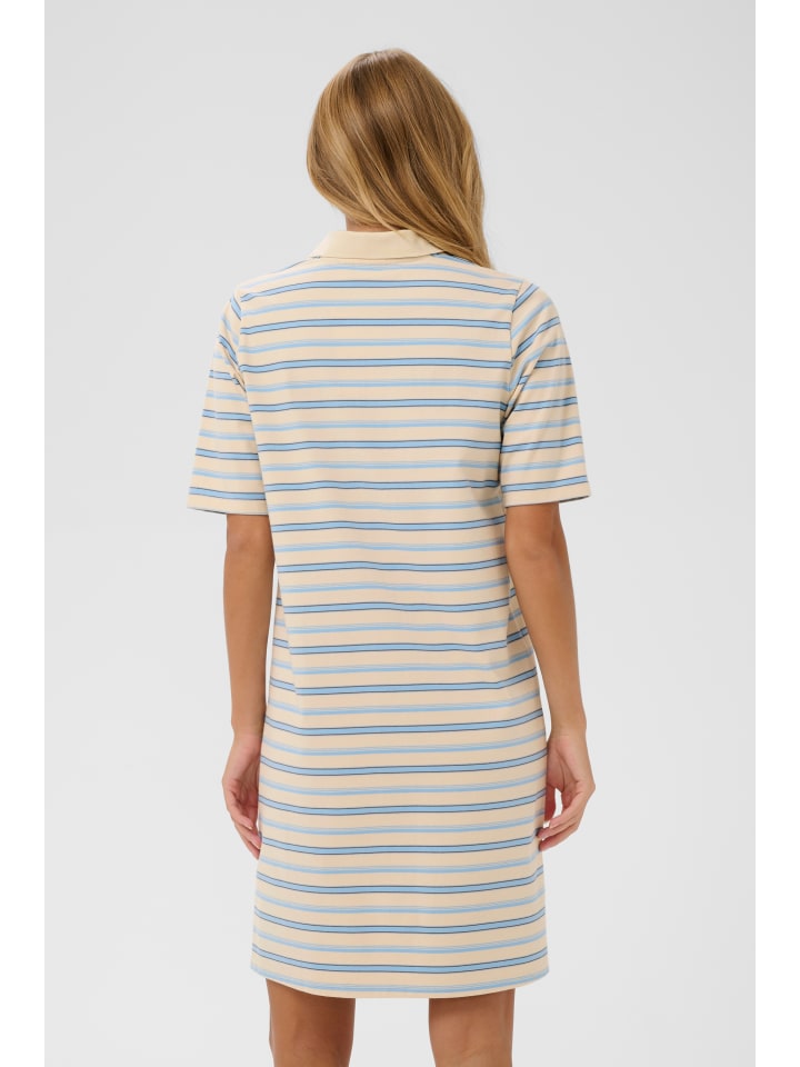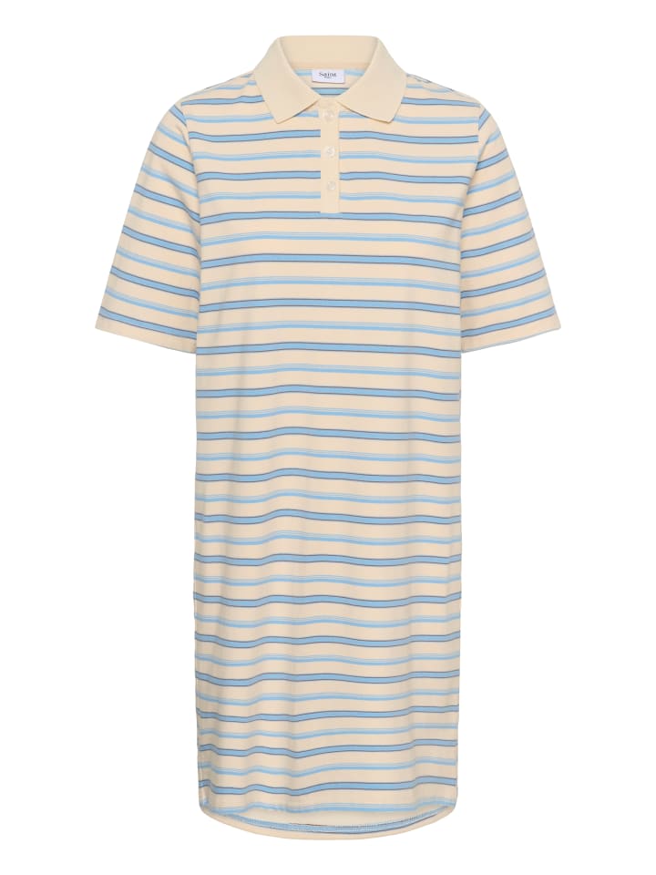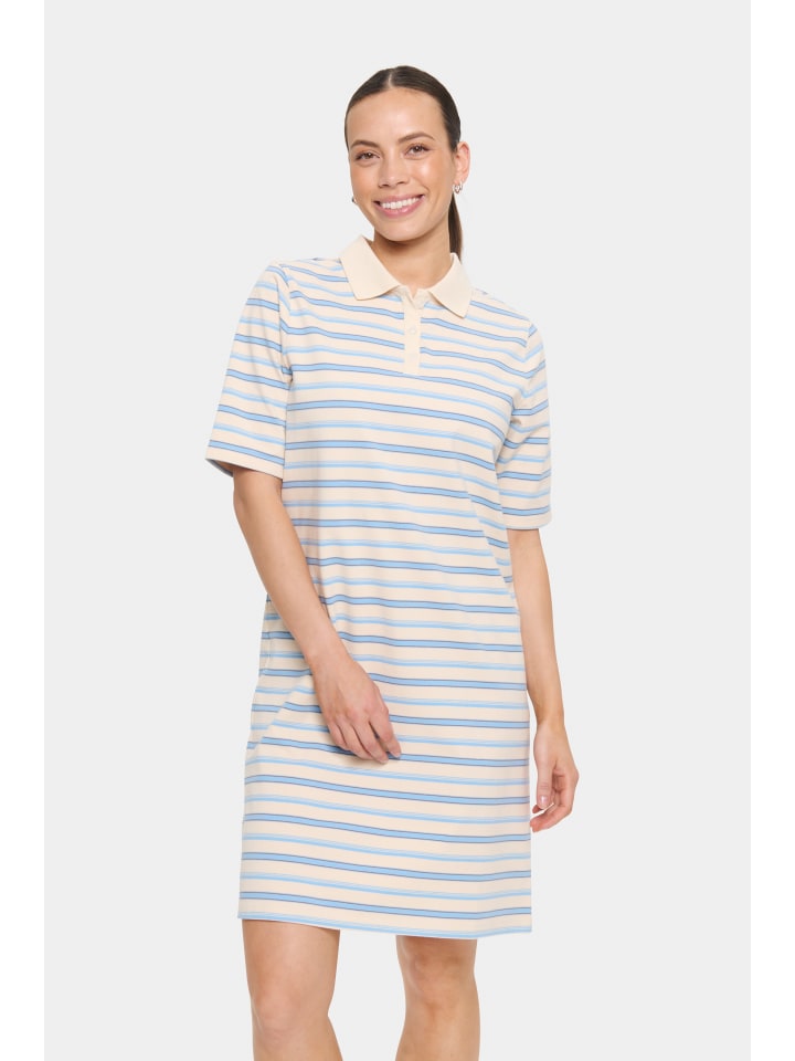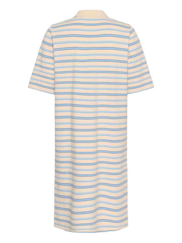 Это женское платье-поло свободного прямого кроя с классическим воротником-поло, короткими рукавами и подолом до колена. Мягкое на ощупь - идеально подходит для повседневной носки.