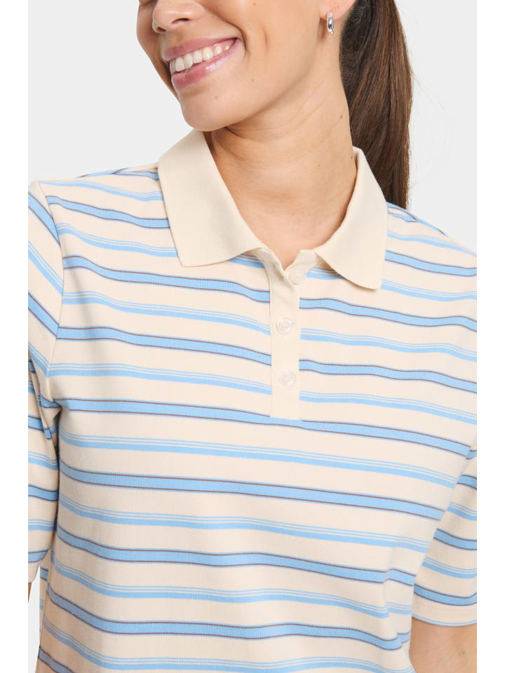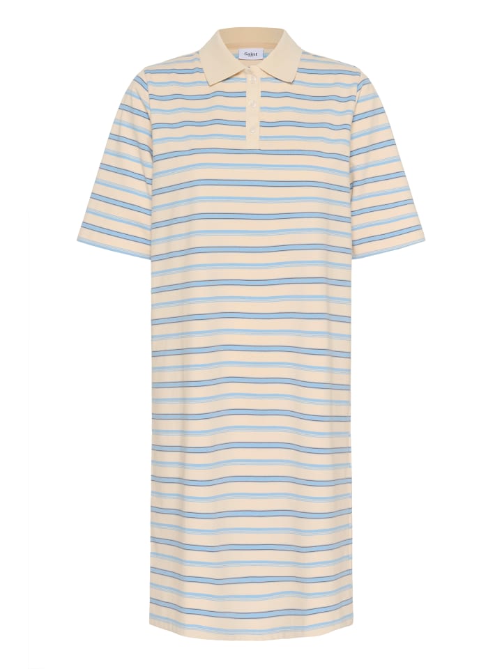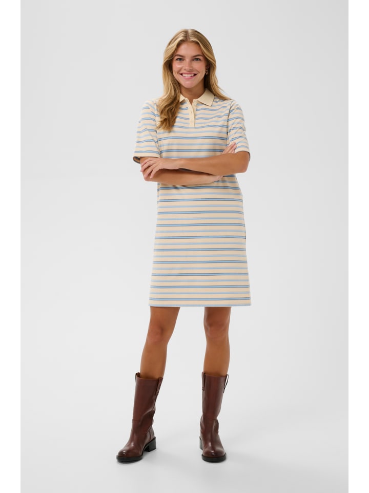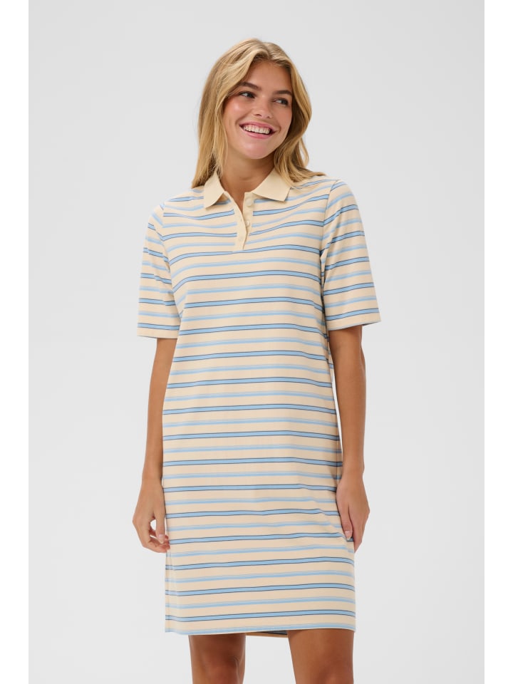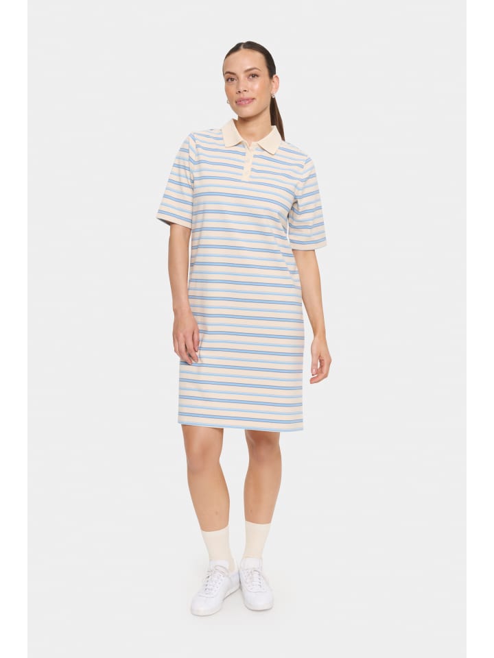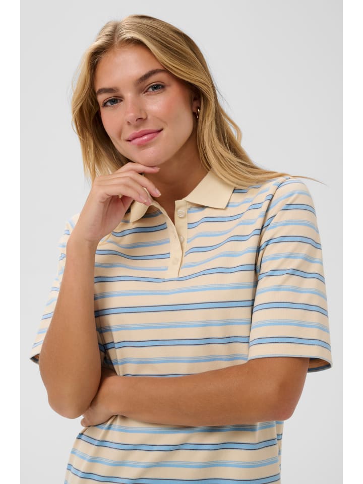Это женское платье-поло свободного прямого кроя с классическим воротником-поло, короткими рукавами и подолом до колена. Мягкое на ощупь - идеально подходит для повседневной носки.
