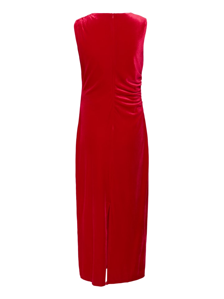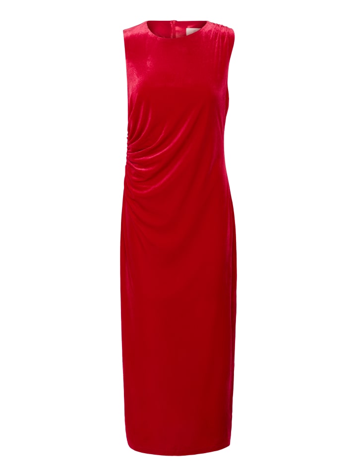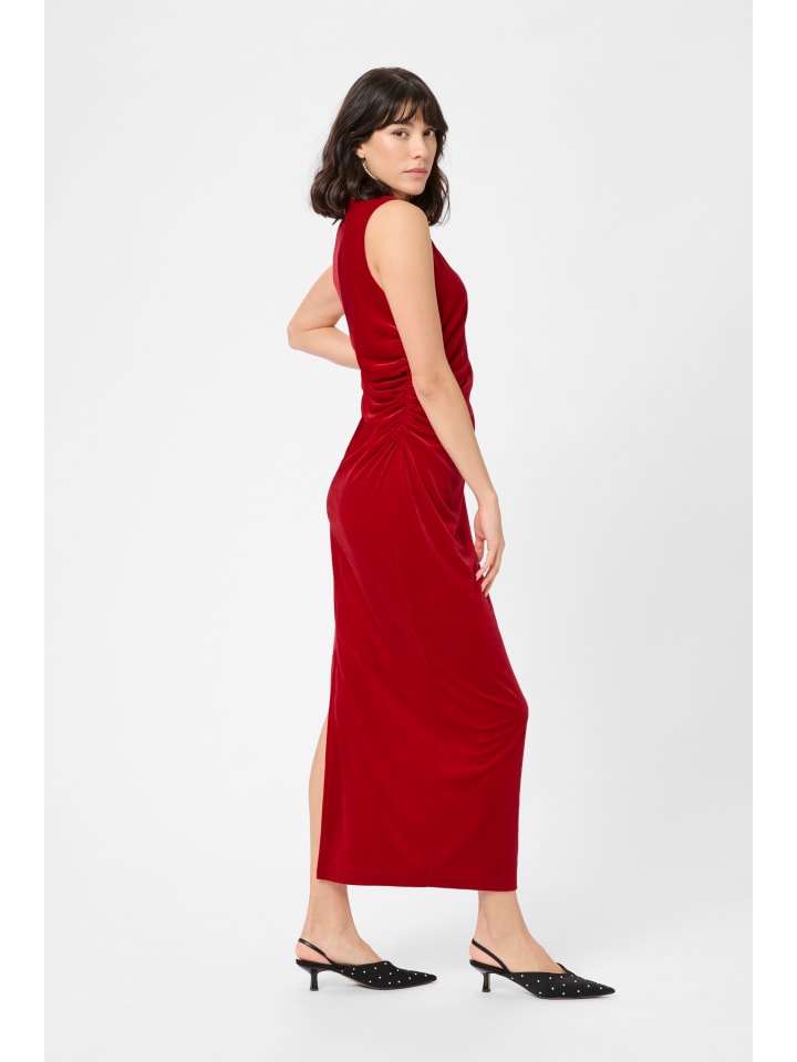 Платье без рукавов с бархатистой отделкой, прямым макси-кроем и эффектными сборками по бокам. Круглый вырез горловины создает классический образ.