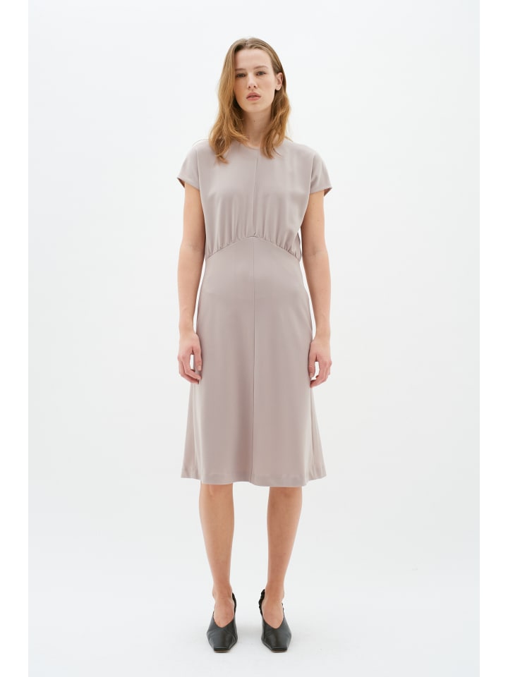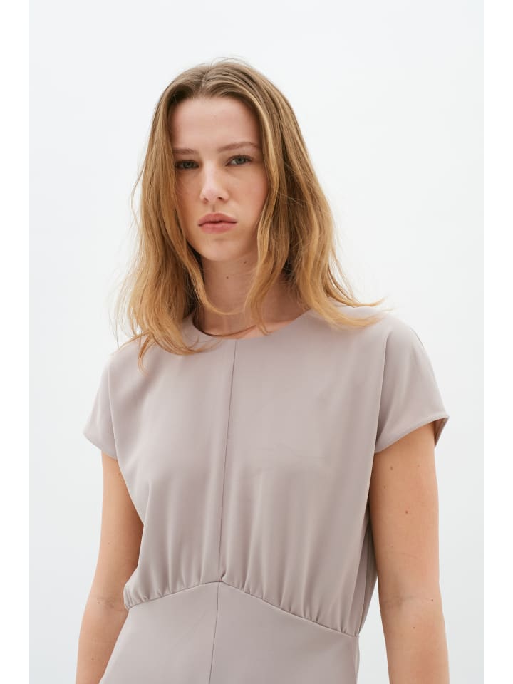 Мягкое платье миди прямого кроя с изящными складками под грудью. Круглый вырез горловины, короткие рукава, слегка расклешенный подол.