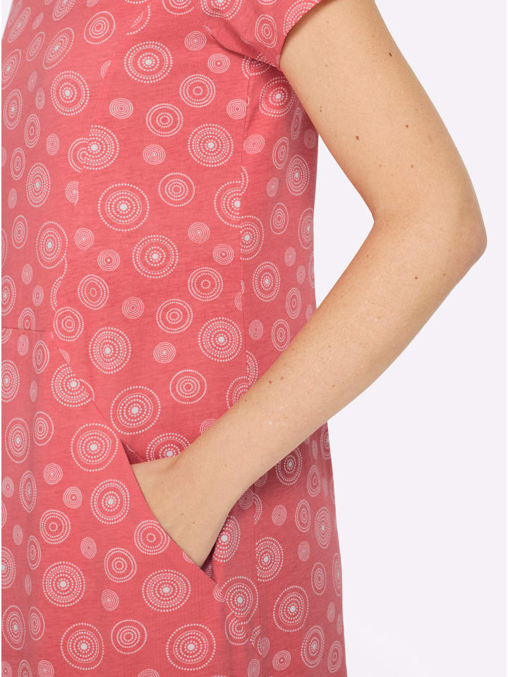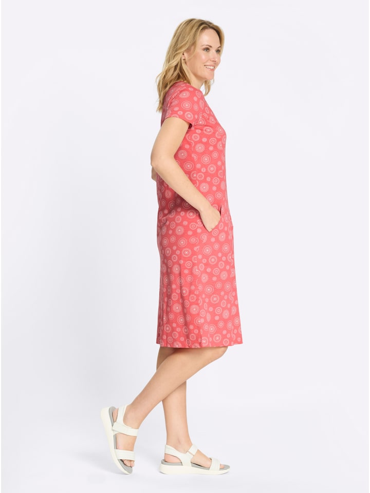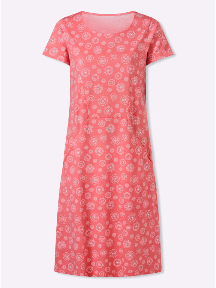 Это легкое трикотажное платье с привлекательным узором - незаменимая вещь в каждом гардеробе! Оно имеет женственный круглый вырез и короткие рукава. С моделирующими швами, диагональными швами и карманами в боковых швах.