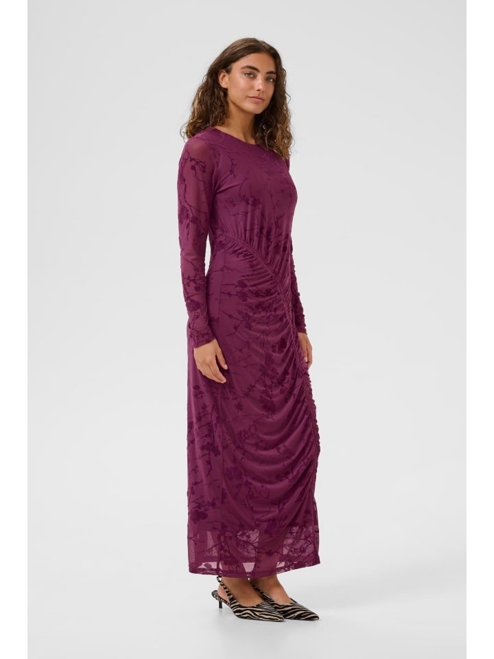 Это женское платье миди облегающего кроя с длинными рукавами и круглым вырезом. Прозрачная сетка и сборка обеспечат стильный образ для торжеств и различных мероприятий.