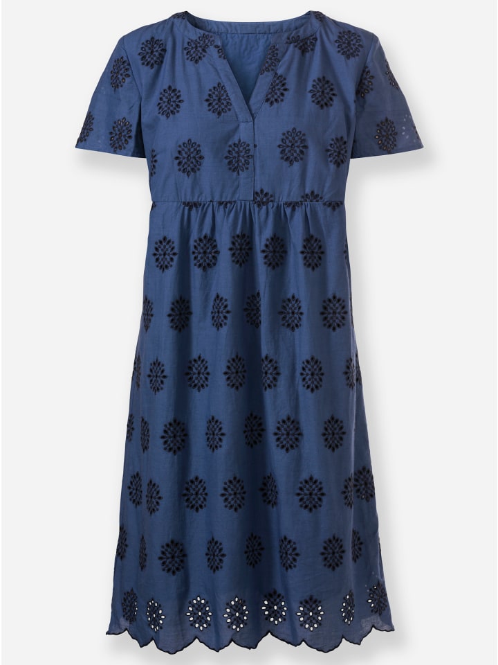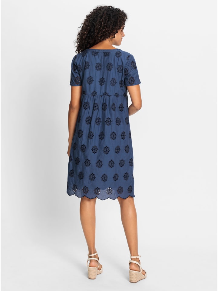 Вы будете очарованы этим платьем-туникой с модной вышивкой ажурными петлями. Приятная для кожи хлопковая ткань имеет подкладку для полного закрытия спереди и сзади. Платье удобно надевается без застежек, имеет круглый вырез, перекрывающийся V-образный вырез и короткие рукава. Сборка по центральному шву спереди добавляет объема. Отделка декоративным фестончатым краем. В соответствии с инициативой «Хлопок, сделанный в Африке».