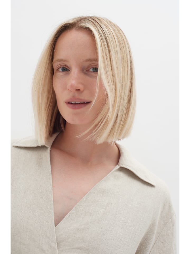 Платье-рубашка свободного кроя с открытым воротником, V-образным вырезом и длинными рукавами с расклешенными присборенными манжетами. Длина до колена, прямой крой.