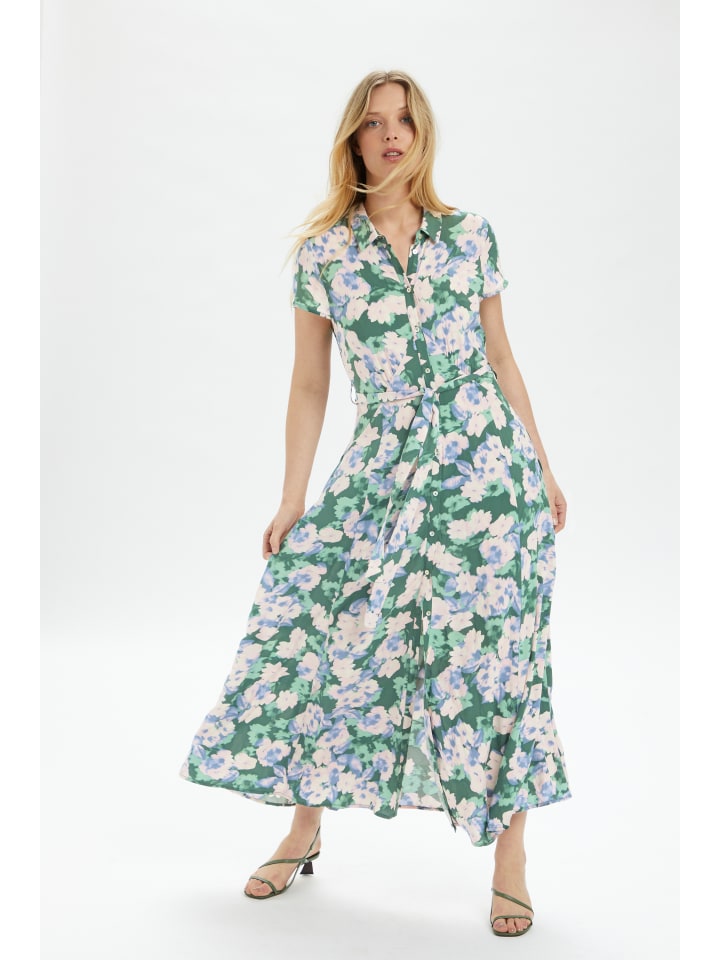 Это платье-рубашка прямого кроя с классическим воротником, короткими рукавами и застежкой на пуговицы. Завязывающийся пояс подчеркивает талию, а длина макси добавляет непринужденности.