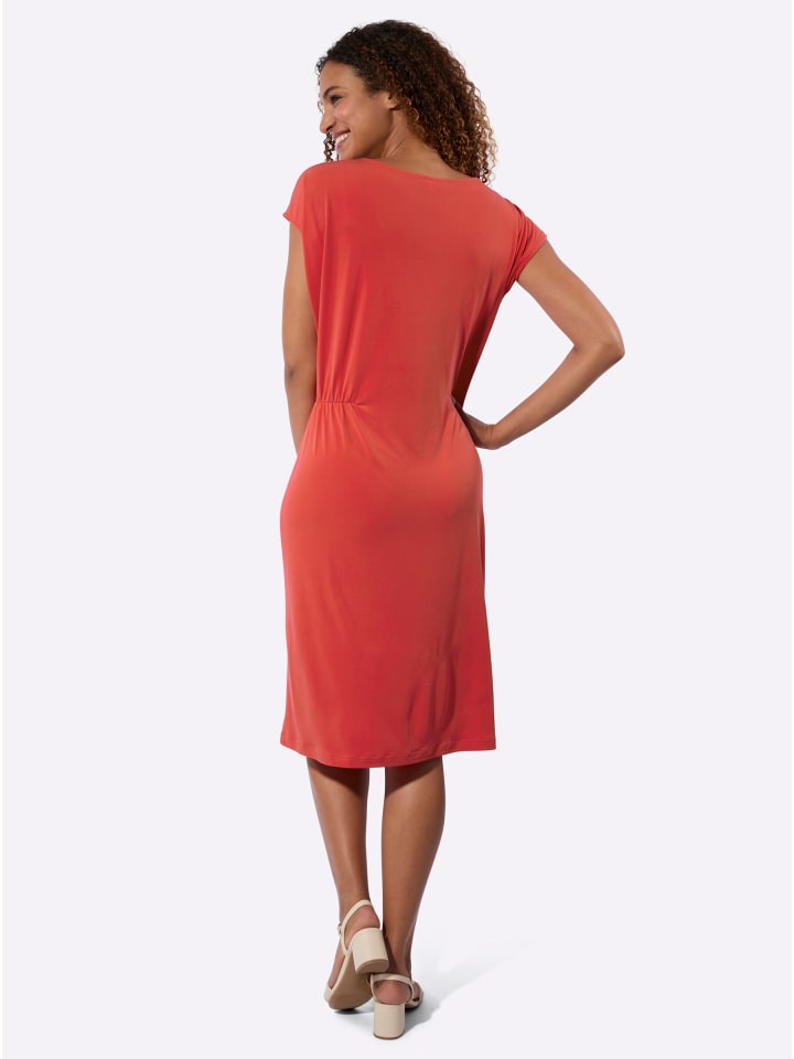 Подчеркивает фигуру и привлекает внимание: шикарное трикотажное платье с привлекательными складками и модной линией талии благодаря эластичным сборкам. Круглый вырез горловины и спущенная линия плеча. Изготовлено из переработанного полиэстера.