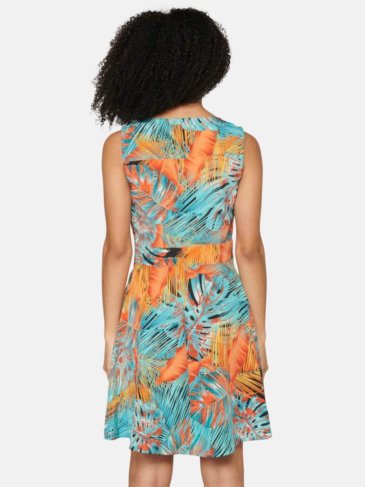 Платье с короткими рукавами. Вырез горловины «клюв». Отрез по талии. Тропический принт. Состав: 100% полиэстер