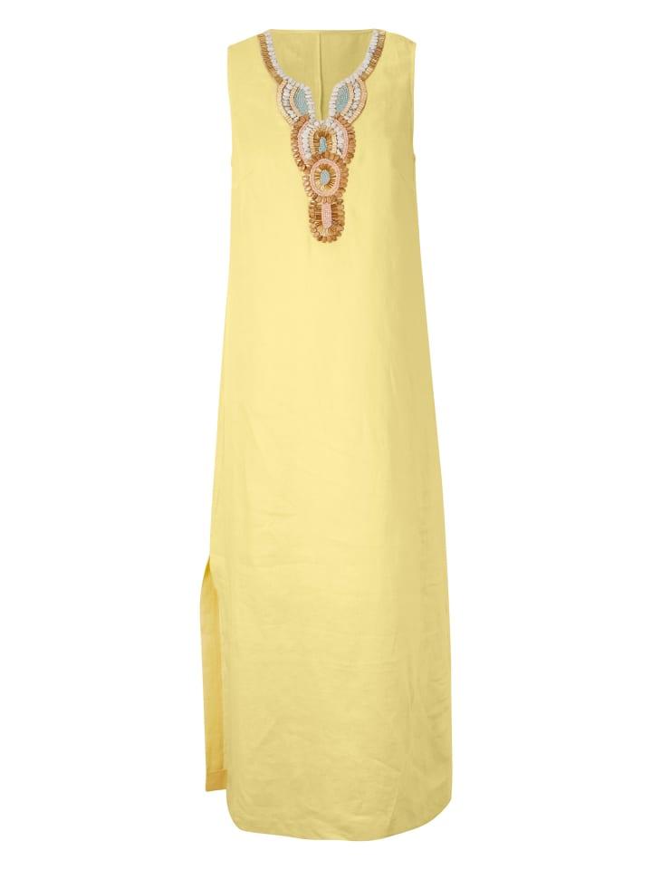 Льняное платье. Платье макси без рукавов, свободного кроя, с разрезом сбоку, выгодно подчеркивающее фигуру. Простое и удобное, выполнено из чистого льна. Украшено эффектной декоративной аппликацией из жемчуга.