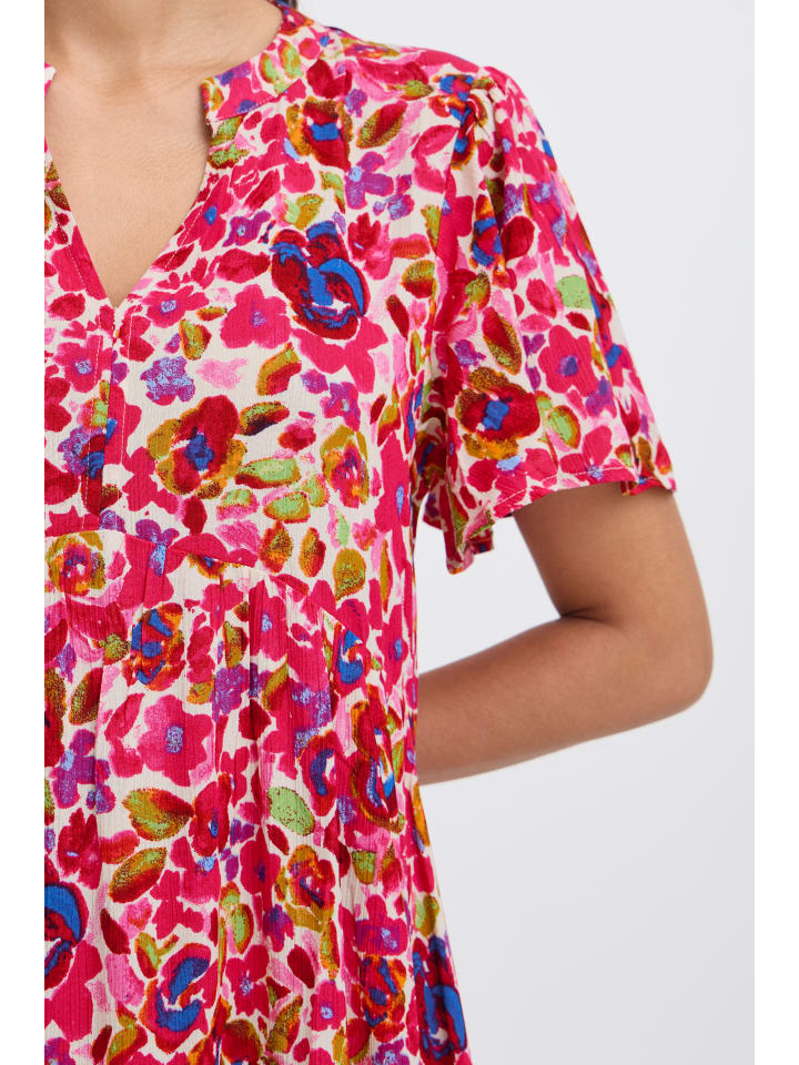 Короткое платье с цветочным принтом по всей поверхности, V-образным вырезом и короткими рукавами. Свободный А-образный крой обеспечивает комфорт.