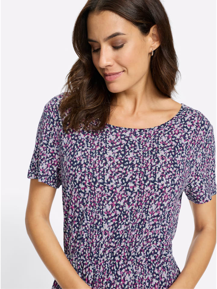 Танцевайте грациозно в теплые месяцы в этом минималистичном трикотажном платье из гладкой, мягкой вискозной эластичной ткани с пышной юбкой. Платье имеет эластичный пояс, круглый вырез горловины и короткие рукава. Изготовлено из вискозы ECOVERO от Lenzing.