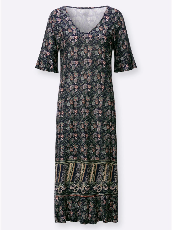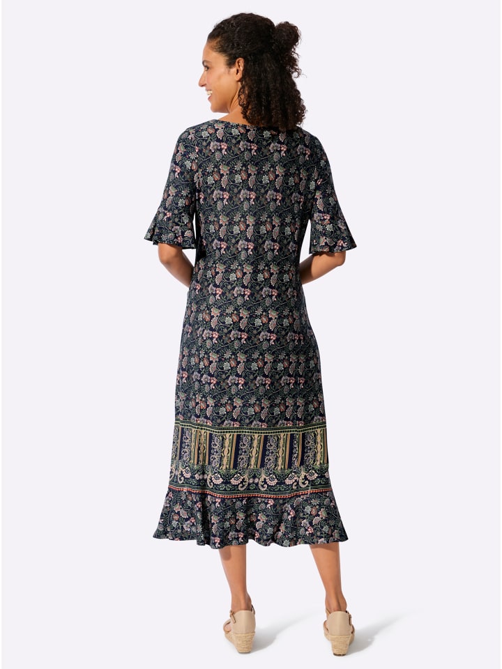 Это платье из джерси с цветочным принтом, из мягкой, струящейся ткани и подчеркивающего фигуру силуэта, подарит вам ощущение легкости и свежести на весь день! Оно имеет визуально удлиняющий V-образный вырез и моделирующие швы «принцесса». Декоративные оборки украшают короткие рукава и подол, которые также украшены каймой.