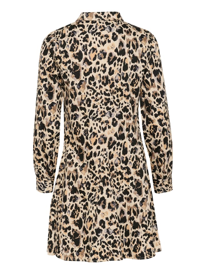 Мини-платье с леопардовым принтом, отложным воротником, свободным кроем, длинными рукавами с манжетами и слегка расклешенным подолом.