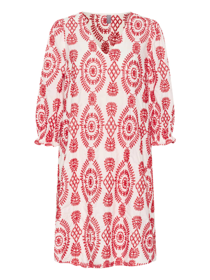 Платье А-силуэта с эффектной вышивкой по всей поверхности, мягкий силуэт, V-образный вырез и широкие рукава 3/4 со сборками на манжетах. Длина до колена, свободный вид.
