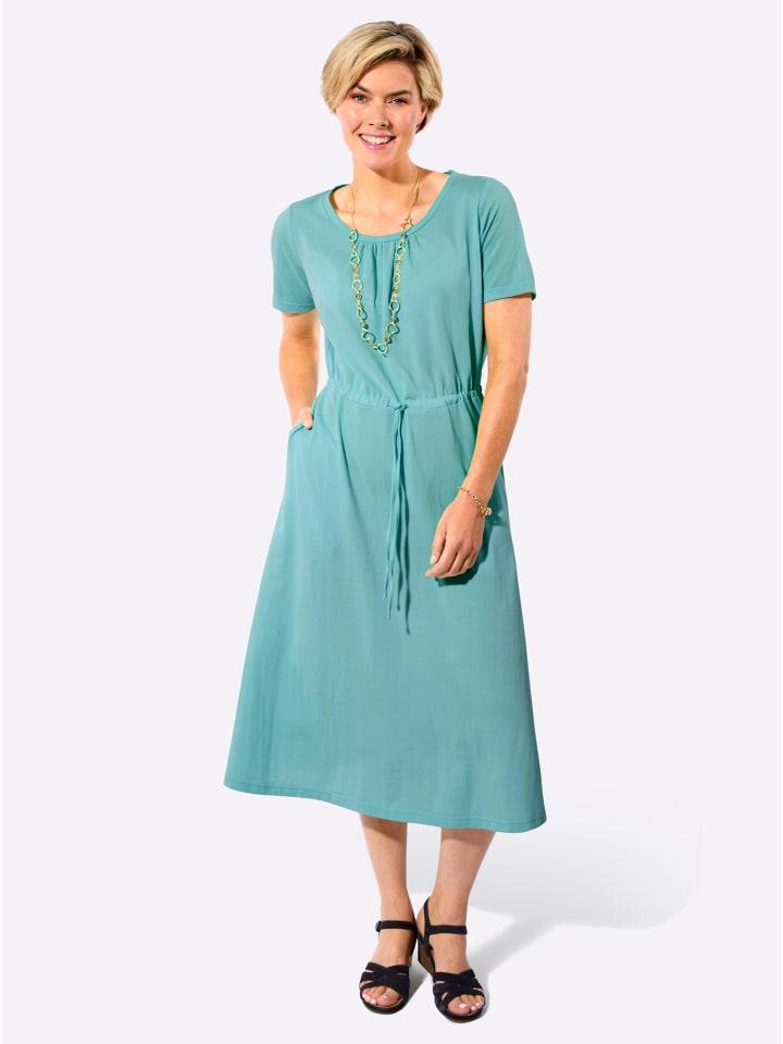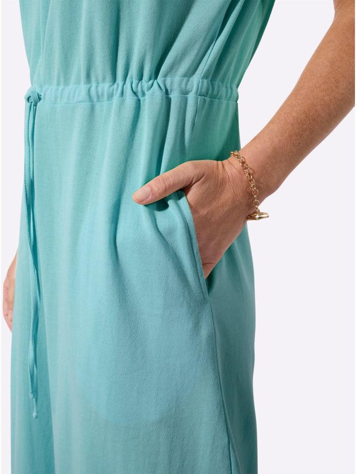 Мягкое и удобное платье из трикотажа пике, слегка расклешенного кроя. Круглый вырез горловины с отделкой и легкой сборкой по центру. Талия на кулиске с завязкой и карманами в боковых швах.