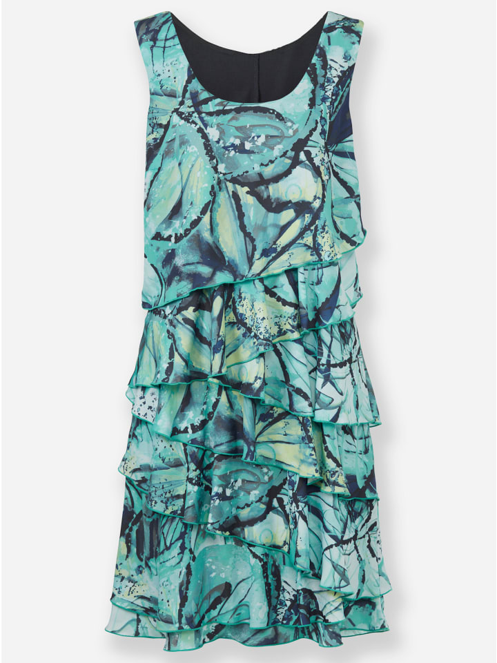 Потрясающе красивое платье с воланами и женственным многослойным силуэтом. Изготовлено из воздушной ткани жоржет со свободной драпировкой. Удобная трикотажная подкладка с утягивающими вытачками спереди и сзади. Потайная молния сбоку. Изготовлено из переработанного полиэстера.