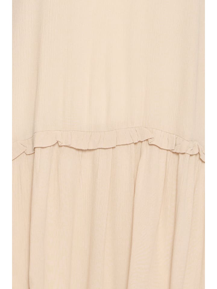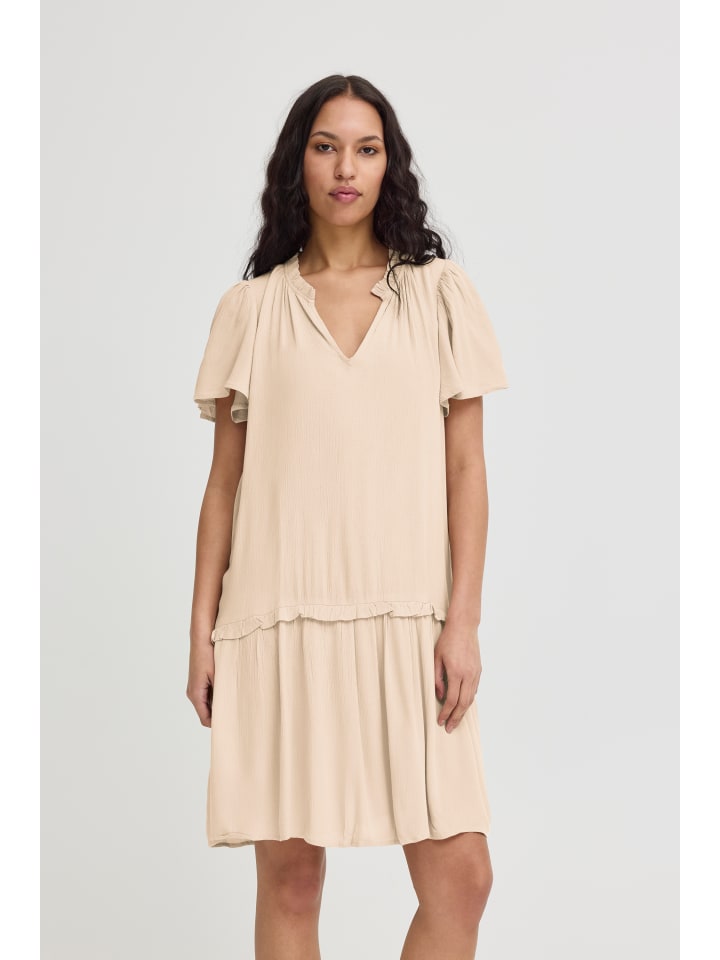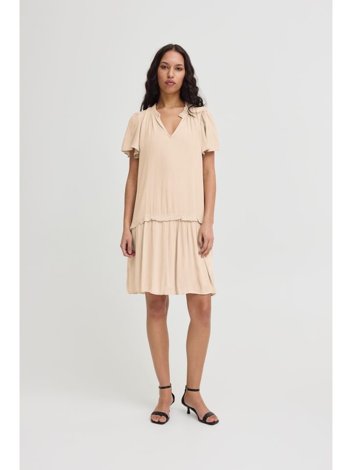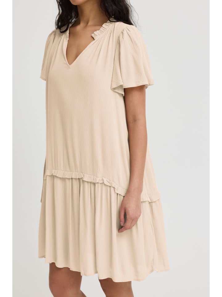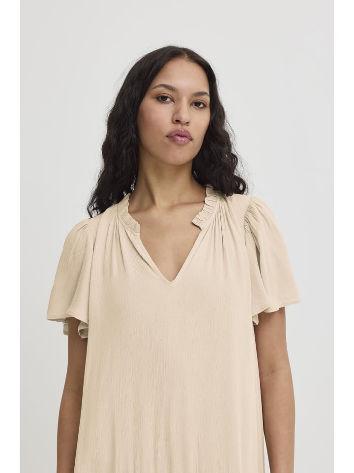 Платье с короткими рукавами, прямым силуэтом, присборенным V-образным вырезом и мягким оборчатым подолом. Легкая текстура придает сдержанную элегантность.