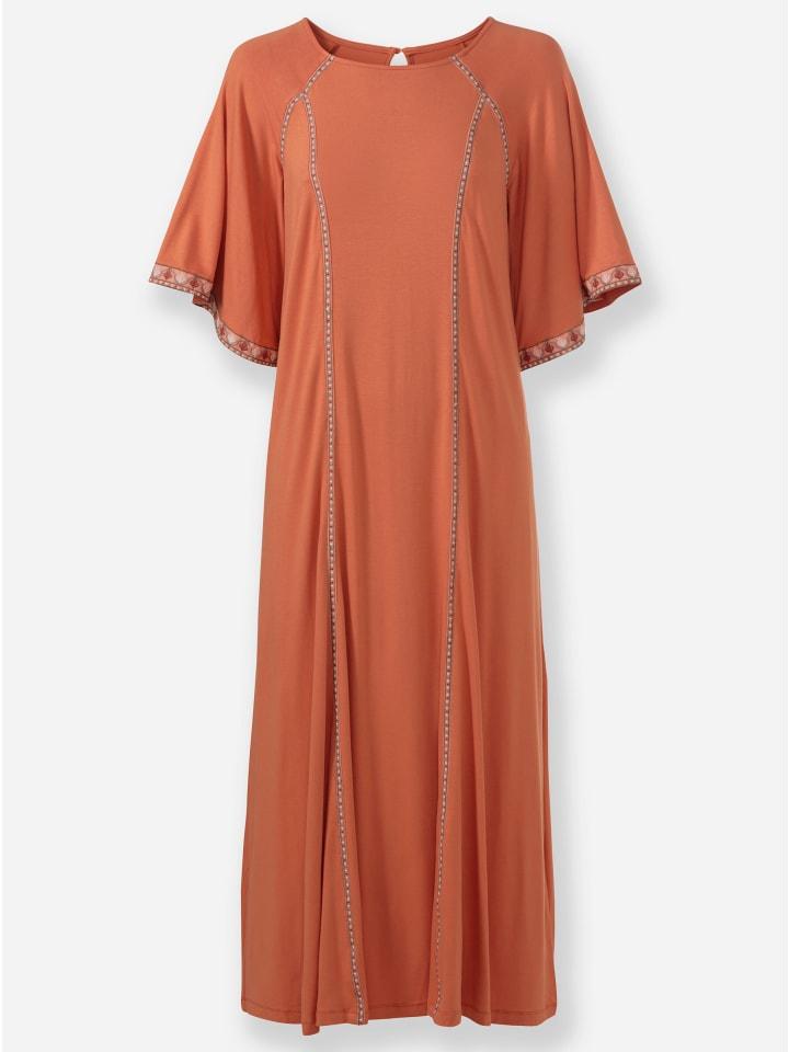Модные акценты этому трикотажному платью придают декоративная вышивка на концах рукавов-крылышек, шве реглан и передних швах. Платье свободно облегает фигуру, имеет круглый вырез горловины и застежку на пуговицы сзади. Расклешенная, струящаяся юбка создает привлекательный силуэт.
