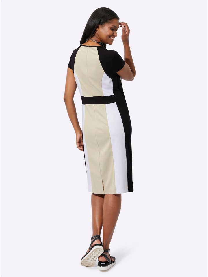 Это трикотажное платье мгновенно визуально стройнит благодаря игре контрастных вставок и моделирующим швам. Вырез горловины «лодочка» и рукава-крылышки, подчеркивающие фигуру. Потайная молния сзади позволяет легко надевать и снимать платье. Разрез сзади завершает образ. Изготовлено из ткани, сохраняющей форму.