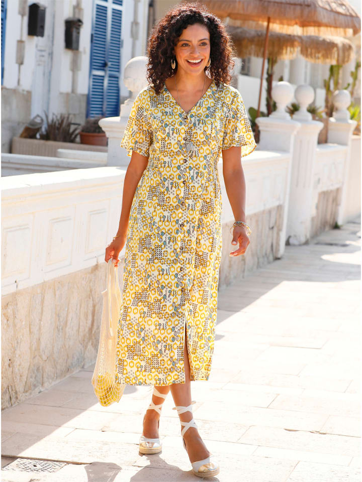 Естественные тона + веселый принт + подчеркивающий фигуру крой: это платье с принтом А-силуэта с струящимися вставками - беспроигрышный вариант. Оно отличается привлекательной сборкой на талии. V-образный вырез, застежка на пуговицы по всей длине, моделирующие швы «принцесса» и короткие рукава-крылышки.