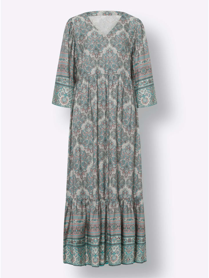 Платье с принтом: Это платье впечатляет своим ярким узором пейсли и приятным на ощупь качеством. Оно имеет V-образный вырез, рукава кимоно длиной три четверти и оборку по низу. Сборки расположены на плечах и швах.