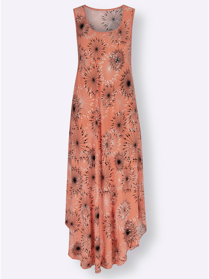 Идеальное платье для летних дней! Великолепный вид благодаря удлиненному асимметричному подолу и очаровательному цветочному узору. Воздушное и легкое благодаря безрукавному крою с круглым вырезом и струящемуся силуэту. Струящаяся ткань. Отделка однотонной окантовкой по круглому вырезу и проймам.