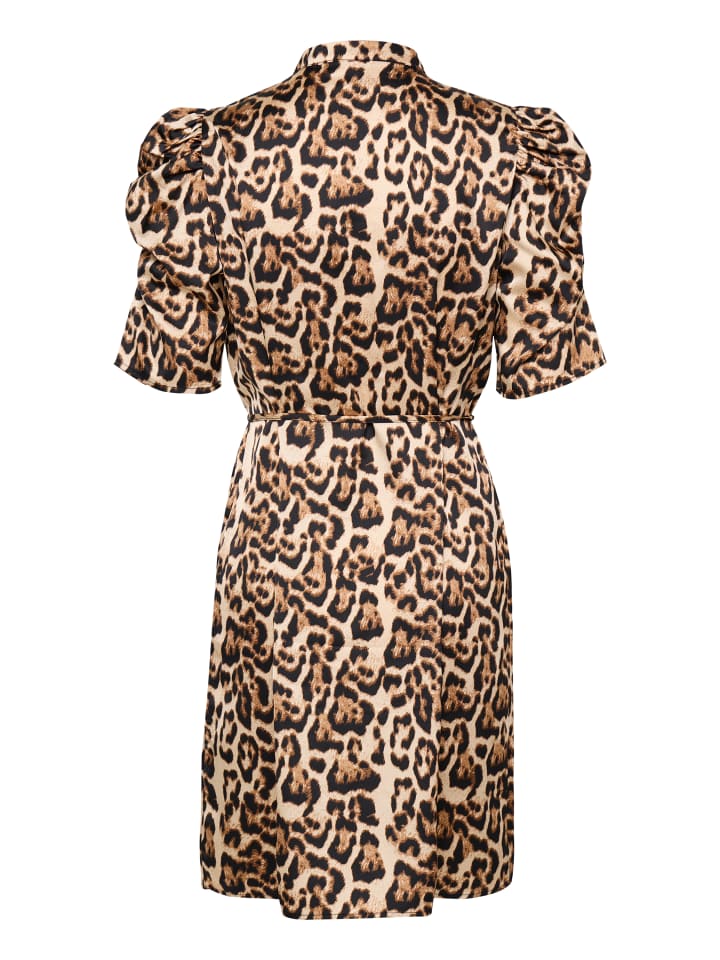 Платье с леопардовым принтом прямого силуэта, рукавами-буфами, рубашечным воротником и поясом-завязкой. Модное, уверенное и привлекающее внимание.