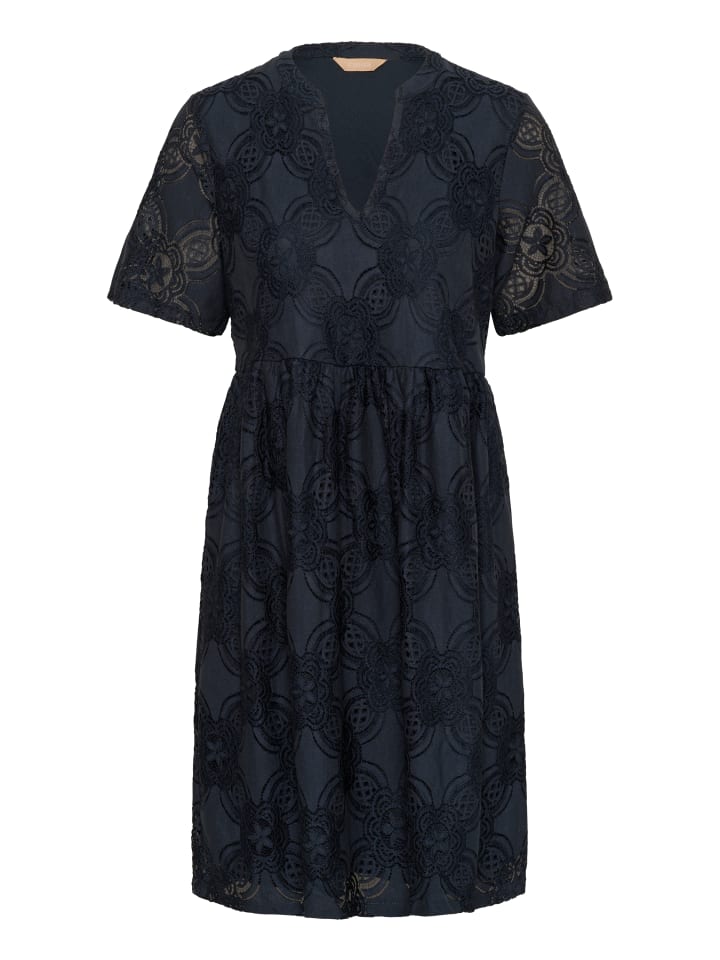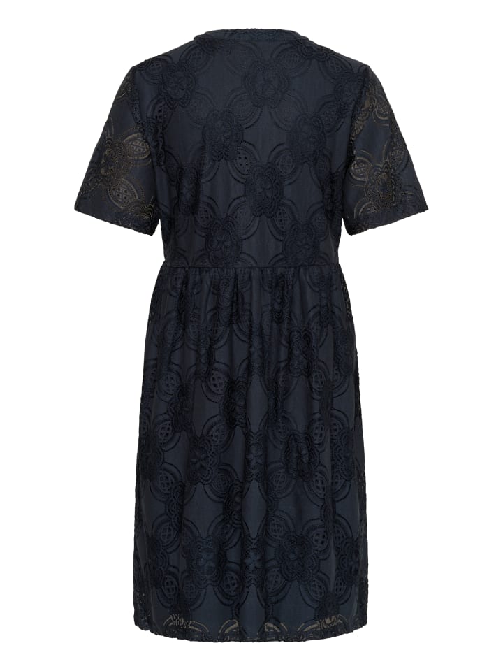 Кружевное платье с мягкой текстурой, V-образным вырезом и короткими рукавами. Свободный расклешенный силуэт, длина до колена.