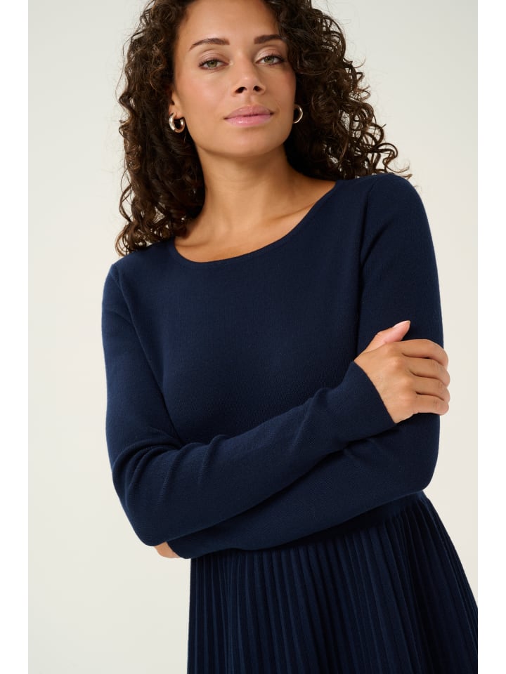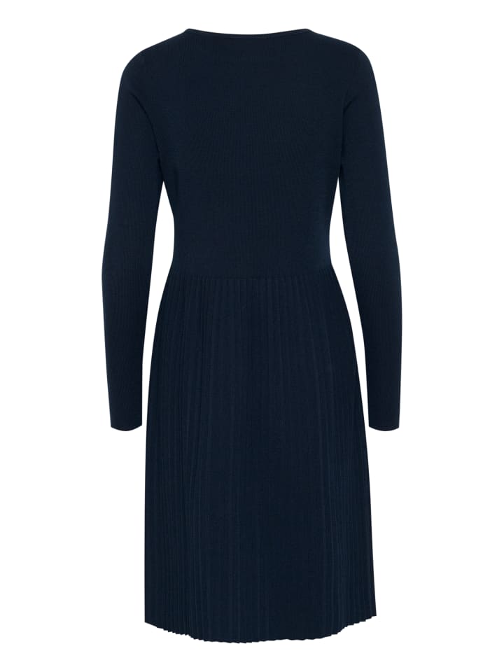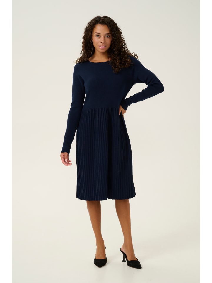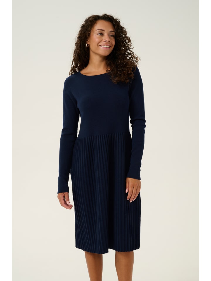 Это женское трикотажное платье элегантного А-силуэта с плиссированной юбкой, длинными рукавами и круглым вырезом. Длина до колена обеспечивает комфорт и подходит для самых разных случаев.
