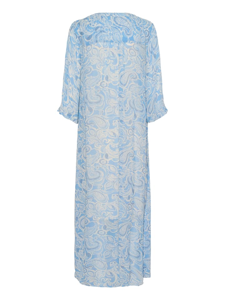 Это женское платье впечатляет свободным кроем, V-образным вырезом и рукавами три четверти. Легкая ткань и длинный силуэт обеспечивают максимальный комфорт.
